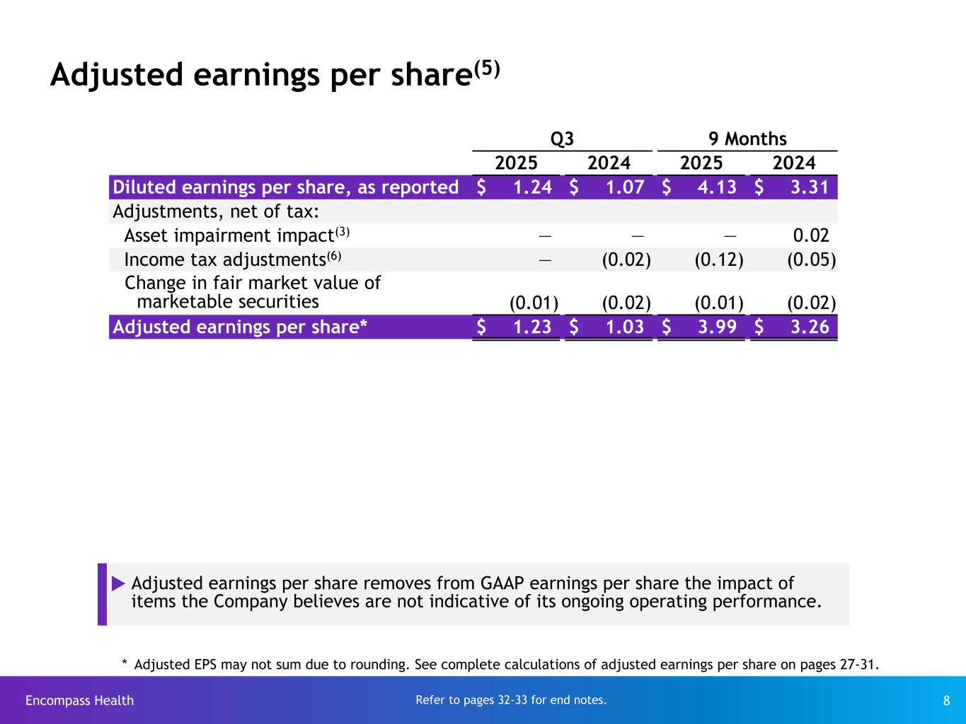 Encompass Health 7 Earnings per share - as reported Q3 9 Months ($ in millions, except per share data) 2025 2024 2025 2024 Adjusted EBITDA $ 300.1 $ 269.3 $ 932.3 $ 814.1 Depreciation and amortization (82.4) (78.4) (241.5) (221.6) Interest expense and amortization of debt discounts and fees (30.8) (34.9) (93.0) (104.4) Stock-based compensation (14.3) (12.9) (38.1) (35.8) Loss on disposal or impairment of assets(3) (1.9) (0.6) (2.4) (11.3) 170.7 142.5 557.3 441.0 Items not indicative of ongoing operating performance: Loss on early extinguishment of debt(4) — (0.4) — (0.4) Change in fair market value of marketable securities 1.1 2.8 2.1 2.7 Asset impairment impact on noncontrolling interests(3) — — — 7.3 Pre-tax income 171.8 144.9 559.4 450.6 Income tax expense (44.9) (36.0) (137.5) (112.6) Income from continuing operations* $ 126.9 $ 108.9 $ 421.9 $ 338.0 Diluted shares (see page 23) 102.3 102.1 102.3 102.2 Diluted earnings per share* $ 1.24 $ 1.07 $ 4.13 $ 3.31 * Earnings per share are determined using income from continuing operations attributable to Encompass Health. Reconciliations to GAAP provided on pages 24-31. Refer to pages 32-33 for end notes.