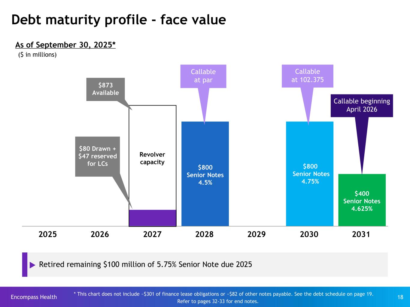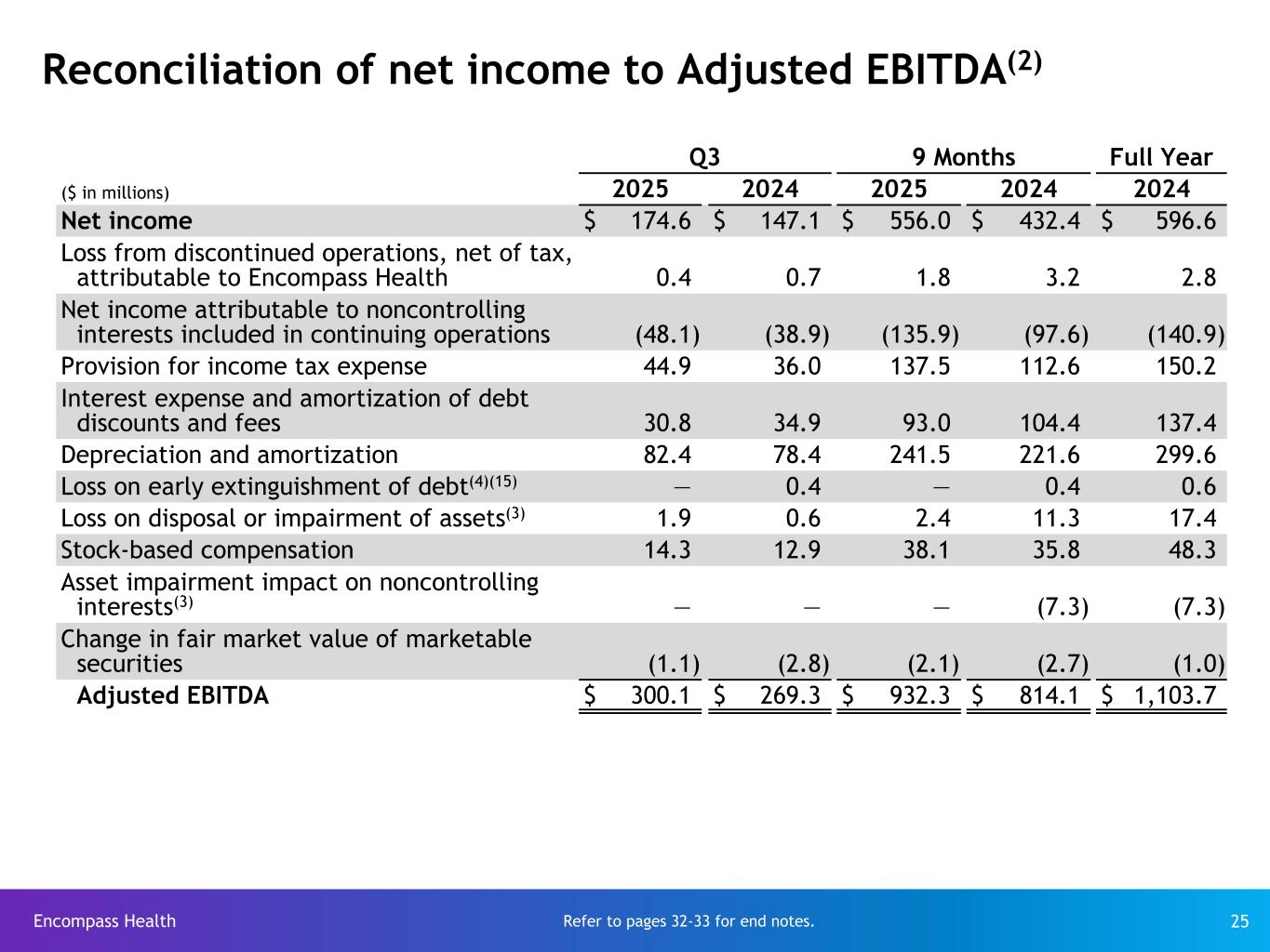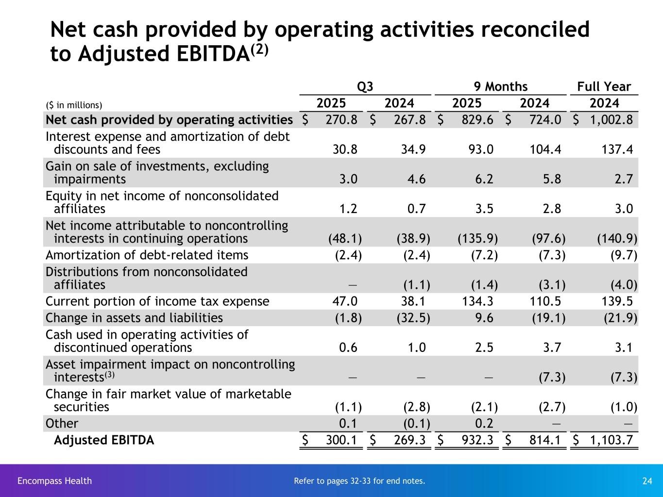 Encompass Health 24 Net cash provided by operating activities reconciled to Adjusted EBITDA(2) Q3 9 Months Full Year ($ in millions) 2025 2024 2025 2024 2024 Net cash provided by operating activities $ 270.8 $ 267.8 $ 829.6 $ 724.0 $ 1,002.8 Interest expense and amortization of debt discounts and fees 30.8 34.9 93.0 104.4 137.4 Gain on sale of investments, excluding impairments 3.0 4.6 6.2 5.8 2.7 Equity in net income of nonconsolidated affiliates 1.2 0.7 3.5 2.8 3.0 Net income attributable to noncontrolling interests in continuing operations (48.1) (38.9) (135.9) (97.6) (140.9) Amortization of debt-related items (2.4) (2.4) (7.2) (7.3) (9.7) Distributions from nonconsolidated affiliates — (1.1) (1.4) (3.1) (4.0) Current portion of income tax expense 47.0 38.1 134.3 110.5 139.5 Change in assets and liabilities (1.8) (32.5) 9.6 (19.1) (21.9) Cash used in operating activities of discontinued operations 0.6 1.0 2.5 3.7 3.1 Asset impairment impact on noncontrolling interests(3) — — — (7.3) (7.3) Change in fair market value of marketable securities (1.1) (2.8) (2.1) (2.7) (1.0) Other 0.1 (0.1) 0.2 — — Adjusted EBITDA $ 300.1 $ 269.3 $ 932.3 $ 814.1 $ 1,103.7 Refer to pages 32-33 for end notes.