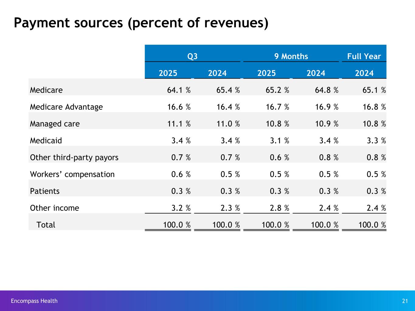 Encompass Health 20 0.0% 2.5% 5.0% 7.5% 10.0% New-store/same-store growth Discharges Q4 2022 Q1 2023 Q2 2023 Q3 2023 Q4 2023 Q1 2024 Q2 2024 Q3 2024 Q4 2024 Q1 2025 Q2 2025 Q3 2025 New store 3.1% 3.5% 3.6% 3.0% 3.0% 3.3% 1.9% 2.0% 2.0% 1.9% 2.5% 2.1% Same store(11) 4.2% 5.9% 6.2% 4.3% 5.3% 6.7% 4.8% 6.8% 5.8% 4.4% 4.7% 2.9% Total by quarter 7.3% 9.4% 9.8% 7.3% 8.3% 10.0% 6.7% 8.8% 7.8% 6.3% 7.2% 5.0% Total by year 6.8% 8.7% 8.3% Same store by year(11) 3.1% 4.8% 5.6% Johnston, RI (50 beds) Fort Mill, SC (39 beds) Athens, GA (40 beds) Knoxville, TN (73 beds) Owasso, OK (40 beds) Clermont, FL (50 beds) Bowie, MD (60 beds) Columbus, GA (40 beds) Prosper, TX (40 beds) Fitchburg, WI (56 beds) Kissimmee, FL (50 beds) Atlanta, GA (40 beds) Louisville, KY (40 beds) Refer to pages 32-33 for end notes. Houston, TX (61 beds) Fort Myers, FL (60 beds) Daytona Beach, FL (50 beds) Danbury, CT (40 beds)