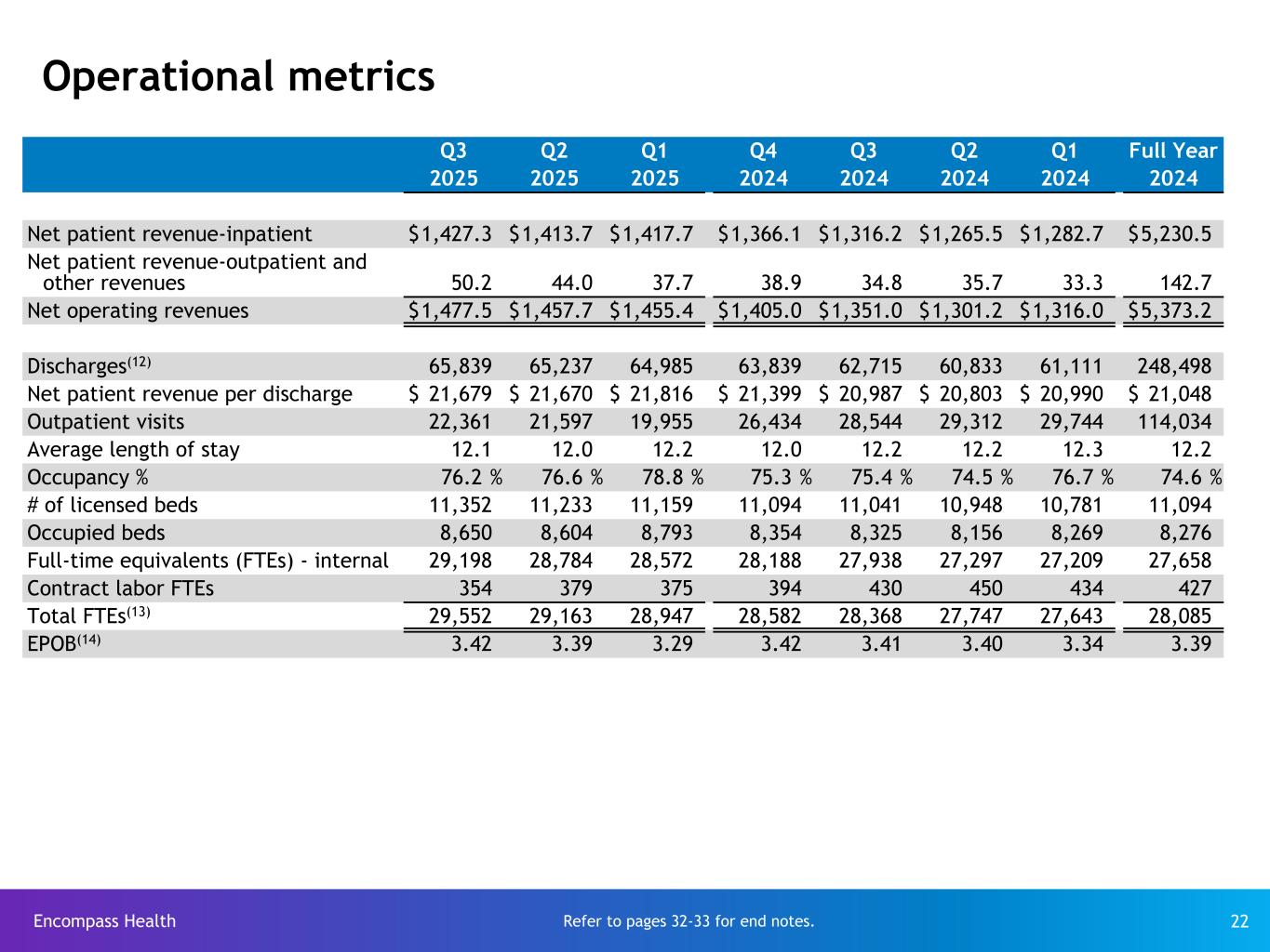 Encompass Health 22 Operational metrics Q3 Q2 Q1 Q4 Q3 Q2 Q1 Full Year 2025 2025 2025 2024 2024 2024 2024 2024 Net patient revenue-inpatient $ 1,427.3 $ 1,413.7 $ 1,417.7 $ 1,366.1 $ 1,316.2 $ 1,265.5 $ 1,282.7 $ 5,230.5 Net patient revenue-outpatient and other revenues 50.2 44.0 37.7 38.9 34.8 35.7 33.3 142.7 Net operating revenues $ 1,477.5 $ 1,457.7 $ 1,455.4 $ 1,405.0 $ 1,351.0 $ 1,301.2 $ 1,316.0 $ 5,373.2 Discharges(12) 65,839 65,237 64,985 63,839 62,715 60,833 61,111 248,498 Net patient revenue per discharge $ 21,679 $ 21,670 $ 21,816 $ 21,399 $ 20,987 $ 20,803 $ 20,990 $ 21,048 Outpatient visits 22,361 21,597 19,955 26,434 28,544 29,312 29,744 114,034 Average length of stay 12.1 12.0 12.2 12.0 12.2 12.2 12.3 12.2 Occupancy % 76.2 % 76.6 % 78.8 % 75.3 % 75.4 % 74.5 % 76.7 % 74.6 % # of licensed beds 11,352 11,233 11,159 11,094 11,041 10,948 10,781 11,094 Occupied beds 8,650 8,604 8,793 8,354 8,325 8,156 8,269 8,276 Full-time equivalents (FTEs) - internal 29,198 28,784 28,572 28,188 27,938 27,297 27,209 27,658 Contract labor FTEs 354 379 375 394 430 450 434 427 Total FTEs(13) 29,552 29,163 28,947 28,582 28,368 27,747 27,643 28,085 EPOB(14) 3.42 3.39 3.29 3.42 3.41 3.40 3.34 3.39 Refer to pages 32-33 for end notes.