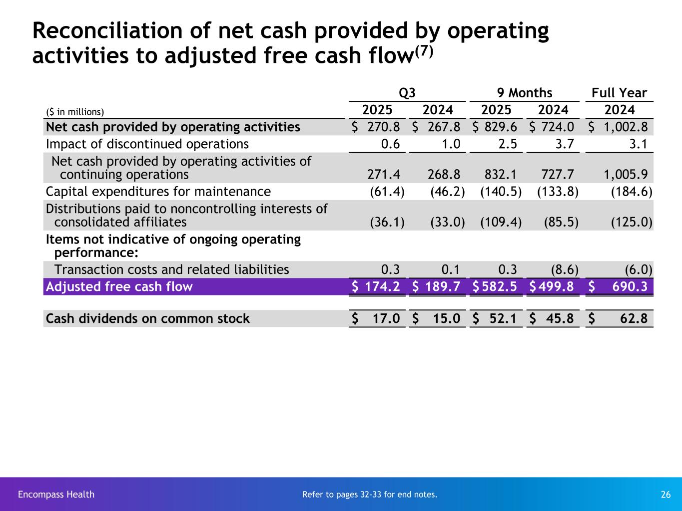 Encompass Health 26 Reconciliation of net cash provided by operating activities to adjusted free cash flow(7) Q3 9 Months Full Year ($ in millions) 2025 2024 2025 2024 2024 Net cash provided by operating activities $ 270.8 $ 267.8 $ 829.6 $ 724.0 $ 1,002.8 Impact of discontinued operations 0.6 1.0 2.5 3.7 3.1 Net cash provided by operating activities of continuing operations 271.4 268.8 832.1 727.7 1,005.9 Capital expenditures for maintenance (61.4) (46.2) (140.5) (133.8) (184.6) Distributions paid to noncontrolling interests of consolidated affiliates (36.1) (33.0) (109.4) (85.5) (125.0) Items not indicative of ongoing operating performance: Transaction costs and related liabilities 0.3 0.1 0.3 (8.6) (6.0) Adjusted free cash flow $ 174.2 $ 189.7 $ 582.5 $ 499.8 $ 690.3 Cash dividends on common stock $ 17.0 $ 15.0 $ 52.1 $ 45.8 $ 62.8 Refer to pages 32-33 for end notes.