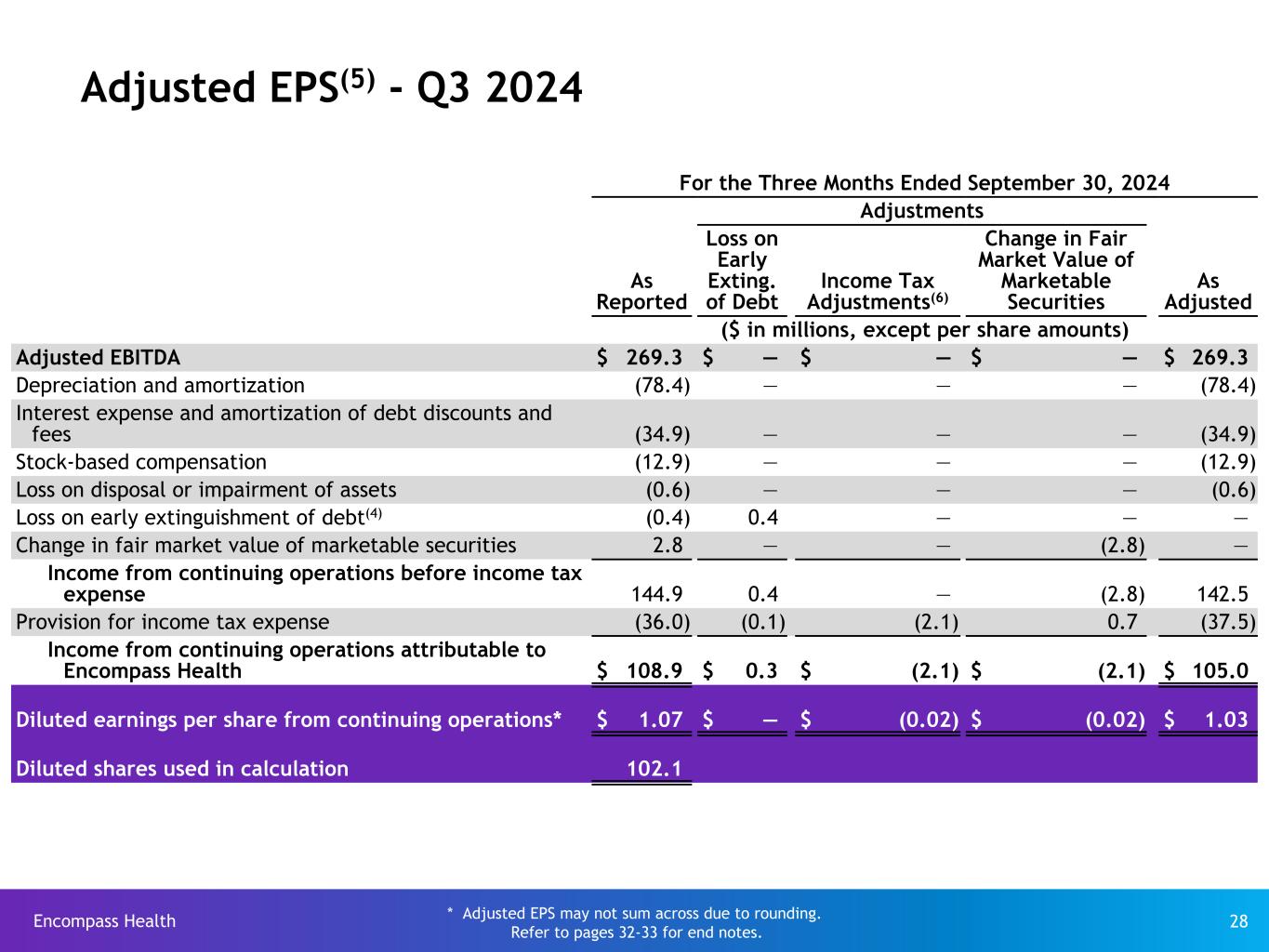 Encompass Health 27 Adjusted EPS(5) - Q3 2025 For the Three Months Ended September 30, 2025 Adjustments As Reported Income Tax Adjustments Change in Fair Market Value of Marketable Securities As Adjusted ($ in millions, except per share amounts) Adjusted EBITDA $ 300.1 $ — $ — $ 300.1 Depreciation and amortization (82.4) — — (82.4) Interest expense and amortization of debt discounts and fees (30.8) — — (30.8) Stock-based compensation (14.3) — — (14.3) Loss on disposal or impairment of assets (1.9) — — (1.9) Change in fair market value of marketable securities 1.1 — (1.1) — Income from continuing operations before income tax expense 171.8 — (1.1) 170.7 Provision for income tax expense (44.9) (0.2) 0.3 (44.8) Income from continuing operations attributable to Encompass Health $ 126.9 $ (0.2) $ (0.8) $ 125.9 Diluted earnings per share from continuing operations* $ 1.24 $ — $ (0.01) $ 1.23 Diluted shares used in calculation 102.3 * Adjusted EPS may not sum across due to rounding. Refer to pages 32-33 for end notes.