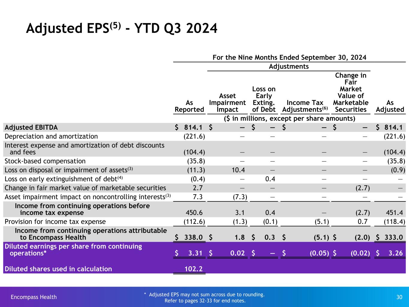 Encompass Health 29 Adjusted EPS(5) - YTD Q3 2025 For the Nine Months Ended September 30, 2025 Adjustments As Reported Income Tax Adjustments(6) Change in Fair Market Value of Marketable Securities As Adjusted ($ in millions, except per share amounts) Adjusted EBITDA $ 932.3 $ — $ — $ 932.3 Depreciation and amortization (241.5) — — (241.5) Interest expense and amortization of debt discounts and fees (93.0) — — (93.0) Stock-based compensation (38.1) — — (38.1) Loss on disposal or impairment of assets (2.4) — — (2.4) Change in fair market value of marketable securities 2.1 — (2.1) — Income from continuing operations before income tax expense 559.4 — (2.1) 557.3 Provision for income tax expense (137.5) (11.8) 0.6 (148.7) Income from continuing operations attributable to Encompass Health $ 421.9 $ (11.8) $ (1.5) $ 408.6 Diluted earnings per share from continuing operations* $ 4.13 $ (0.12) $ (0.01) $ 3.99 Diluted shares used in calculation 102.3 * Adjusted EPS may not sum across due to rounding. Refer to pages 32-33 for end notes.