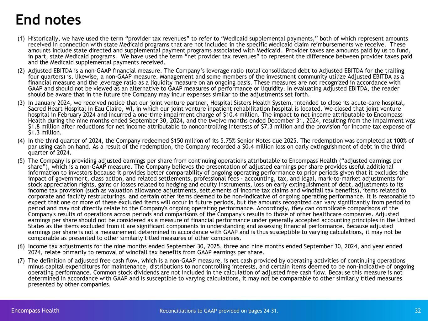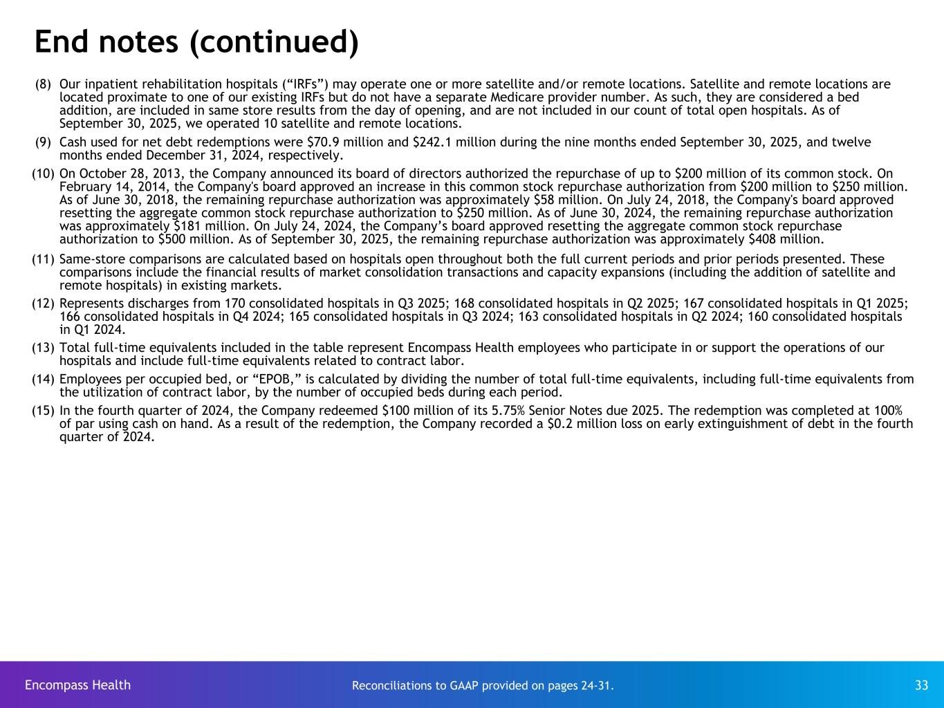 Encompass Health 32 End notes Reconciliations to GAAP provided on pages 24-31. (1) Historically, we have used the term “provider tax revenues” to refer to “Medicaid supplemental payments,” both of which represent amounts received in connection with state Medicaid programs that are not included in the specific Medicaid claim reimbursements we receive. These amounts include state directed and supplemental payment programs associated with Medicaid. Provider taxes are amounts paid by us to fund, in part, state Medicaid programs. We have used the term “net provider tax revenues” to represent the difference between provider taxes paid and the Medicaid supplemental payments received. (2) Adjusted EBITDA is a non-GAAP financial measure. The Company’s leverage ratio (total consolidated debt to Adjusted EBITDA for the trailing four quarters) is, likewise, a non-GAAP measure. Management and some members of the investment community utilize Adjusted EBITDA as a financial measure and the leverage ratio as a liquidity measure on an ongoing basis. These measures are not recognized in accordance with GAAP and should not be viewed as an alternative to GAAP measures of performance or liquidity. In evaluating Adjusted EBITDA, the reader should be aware that in the future the Company may incur expenses similar to the adjustments set forth. (3) In January 2024, we received notice that our joint venture partner, Hospital Sisters Health System, intended to close its acute-care hospital, Sacred Heart Hospital in Eau Claire, WI, in which our joint venture inpatient rehabilitation hospital is located. We closed that joint venture hospital in February 2024 and incurred a one-time impairment charge of $10.4 million. The impact to net income attributable to Encompass Health during the nine months ended September 30, 2024, and the twelve months ended December 31, 2024, resulting from the impairment was $1.8 million after reductions for net income attributable to noncontrolling interests of $7.3 million and the provision for income tax expense of $1.3 million. (4) In the third quarter of 2024, the Company redeemed $150 million of its 5.75% Senior Notes due 2025. The redemption was completed at 100% of par using cash on hand. As a result of the redemption, the Company recorded a $0.4 million loss on early extinguishment of debt in the third quarter of 2024. (5) The Company is providing adjusted earnings per share from continuing operations attributable to Encompass Health (“adjusted earnings per share”), which is a non-GAAP measure. The Company believes the presentation of adjusted earnings per share provides useful additional information to investors because it provides better comparability of ongoing operating performance to prior periods given that it excludes the impact of government, class action, and related settlements, professional fees - accounting, tax, and legal, mark-to-market adjustments for stock appreciation rights, gains or losses related to hedging and equity instruments, loss on early extinguishment of debt, adjustments to its income tax provision (such as valuation allowance adjustments, settlements of income tax claims and windfall tax benefits), items related to corporate and facility restructurings, and certain other items deemed to be non-indicative of ongoing operating performance. It is reasonable to expect that one or more of these excluded items will occur in future periods, but the amounts recognized can vary significantly from period to period and may not directly relate to the Company's ongoing operating performance. Accordingly, they can complicate comparisons of the Company's results of operations across periods and comparisons of the Company's results to those of other healthcare companies. Adjusted earnings per share should not be considered as a measure of financial performance under generally accepted accounting principles in the United States as the items excluded from it are significant components in understanding and assessing financial performance. Because adjusted earnings per share is not a measurement determined in accordance with GAAP and is thus susceptible to varying calculations, it may not be comparable as presented to other similarly titled measures of other companies. (6) Income tax adjustments for the nine months ended September 30, 2025, three and nine months ended September 30, 2024, and year ended 2024, relate primarily to removal of windfall tax benefits from GAAP earnings per share. (7) The definition of adjusted free cash flow, which is a non-GAAP measure, is net cash provided by operating activities of continuing operations minus capital expenditures for maintenance, distributions to noncontrolling interests, and certain items deemed to be non-indicative of ongoing operating performance. Common stock dividends are not included in the calculation of adjusted free cash flow. Because this measure is not determined in accordance with GAAP and is susceptible to varying calculations, it may not be comparable to other similarly titled measures presented by other companies.