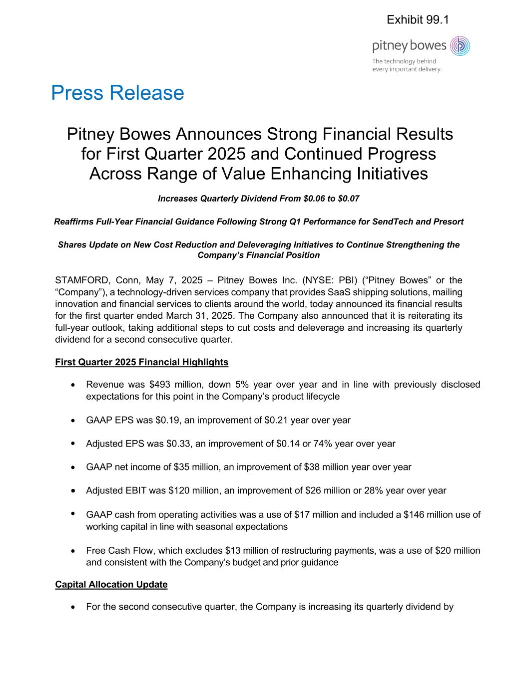 Press Release Pitney Bowes Announces Strong Financial Results for First Quarter 2025 and Continued Progress Across Range of Value Enhancing Initiatives Increases Quarterly Dividend From $0.06 to $0.07 Reaffirms Full-Year Financial Guidance Following Strong Q1 Performance for SendTech and Presort Shares Update on New Cost Reduction and Deleveraging Initiatives to Continue Strengthening the Company’s Financial Position STAMFORD, Conn, May 7, 2025 – Pitney Bowes Inc. (NYSE: PBI) (“Pitney Bowes” or the “Company”), a technology-driven services company that provides SaaS shipping solutions, mailing innovation and financial services to clients around the world, today announced its financial results for the first quarter ended March 31, 2025. The Company also announced that it is reiterating its full-year outlook, taking additional steps to cut costs and deleverage and increasing its quarterly dividend for a second consecutive quarter. First Quarter 2025 Financial Highlights • Revenue was $493 million, down 5% year over year and in line with previously disclosed expectations for this point in the Company’s product lifecycle • GAAP EPS was $0.19, an improvement of $0.21 year over year • Adjusted EPS was $0.33, an improvement of $0.14 or 74% year over year • GAAP net income of $35 million, an improvement of $38 million year over year • Adjusted EBIT was $120 million, an improvement of $26 million or 28% year over year • GAAP cash from operating activities was a use of $17 million and included a $146 million use of working capital in line with seasonal expectations • Free Cash Flow, which excludes $13 million of restructuring payments, was a use of $20 million and consistent with the Company’s budget and prior guidance Capital Allocation Update • For the second consecutive quarter, the Company is increasing its quarterly dividend by Exhibit 99.1
