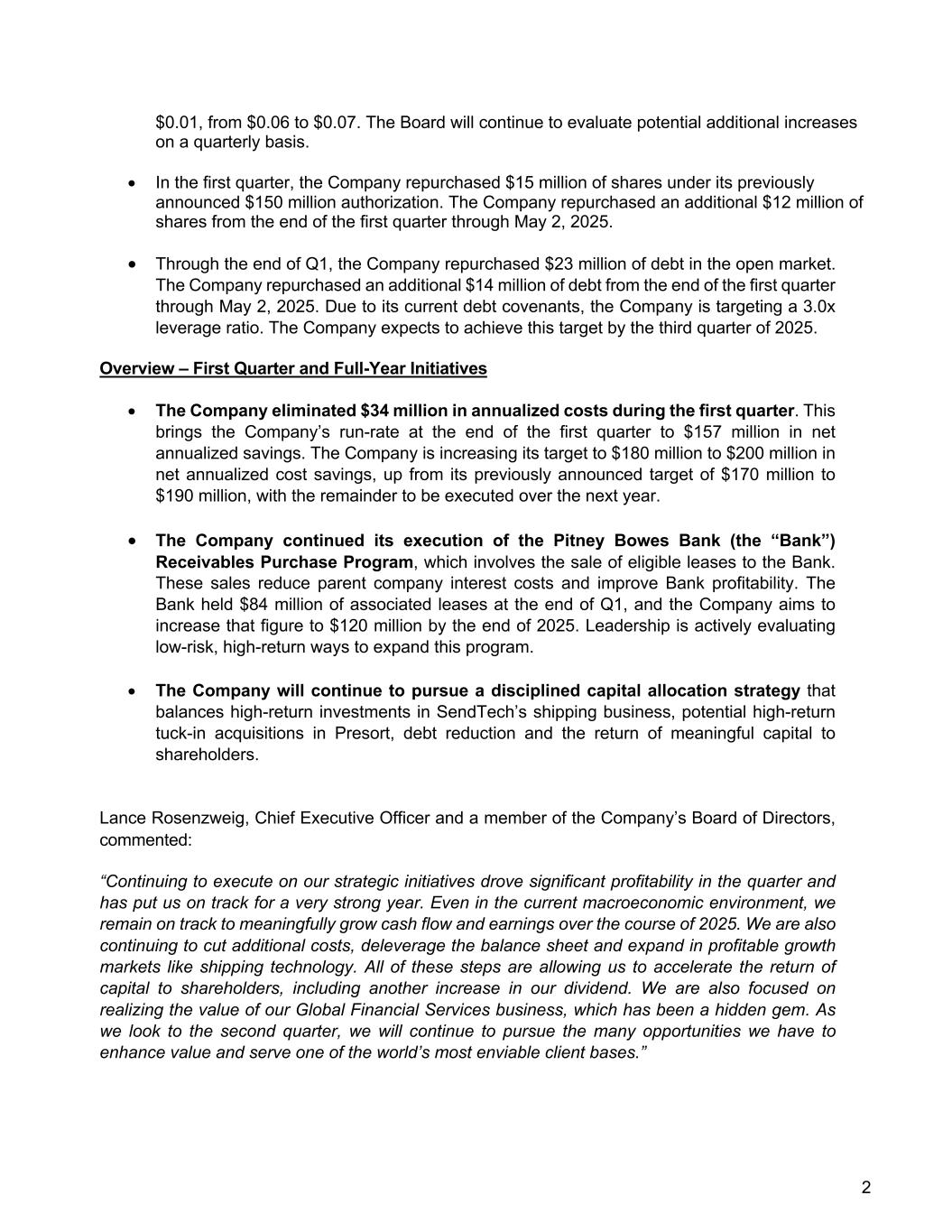 2 $0.01, from $0.06 to $0.07. The Board will continue to evaluate potential additional increases on a quarterly basis. • In the first quarter, the Company repurchased $15 million of shares under its previously announced $150 million authorization. The Company repurchased an additional $12 million of shares from the end of the first quarter through May 2, 2025. • Through the end of Q1, the Company repurchased $23 million of debt in the open market. The Company repurchased an additional $14 million of debt from the end of the first quarter through May 2, 2025. Due to its current debt covenants, the Company is targeting a 3.0x leverage ratio. The Company expects to achieve this target by the third quarter of 2025. Overview – First Quarter and Full-Year Initiatives • The Company eliminated $34 million in annualized costs during the first quarter. This brings the Company’s run-rate at the end of the first quarter to $157 million in net annualized savings. The Company is increasing its target to $180 million to $200 million in net annualized cost savings, up from its previously announced target of $170 million to $190 million, with the remainder to be executed over the next year. • The Company continued its execution of the Pitney Bowes Bank (the “Bank”) Receivables Purchase Program, which involves the sale of eligible leases to the Bank. These sales reduce parent company interest costs and improve Bank profitability. The Bank held $84 million of associated leases at the end of Q1, and the Company aims to increase that figure to $120 million by the end of 2025. Leadership is actively evaluating low-risk, high-return ways to expand this program. • The Company will continue to pursue a disciplined capital allocation strategy that balances high-return investments in SendTech’s shipping business, potential high-return tuck-in acquisitions in Presort, debt reduction and the return of meaningful capital to shareholders. Lance Rosenzweig, Chief Executive Officer and a member of the Company’s Board of Directors, commented: “Continuing to execute on our strategic initiatives drove significant profitability in the quarter and has put us on track for a very strong year. Even in the current macroeconomic environment, we remain on track to meaningfully grow cash flow and earnings over the course of 2025. We are also continuing to cut additional costs, deleverage the balance sheet and expand in profitable growth markets like shipping technology. All of these steps are allowing us to accelerate the return of capital to shareholders, including another increase in our dividend. We are also focused on realizing the value of our Global Financial Services business, which has been a hidden gem. As we look to the second quarter, we will continue to pursue the many opportunities we have to enhance value and serve one of the world’s most enviable client bases.”