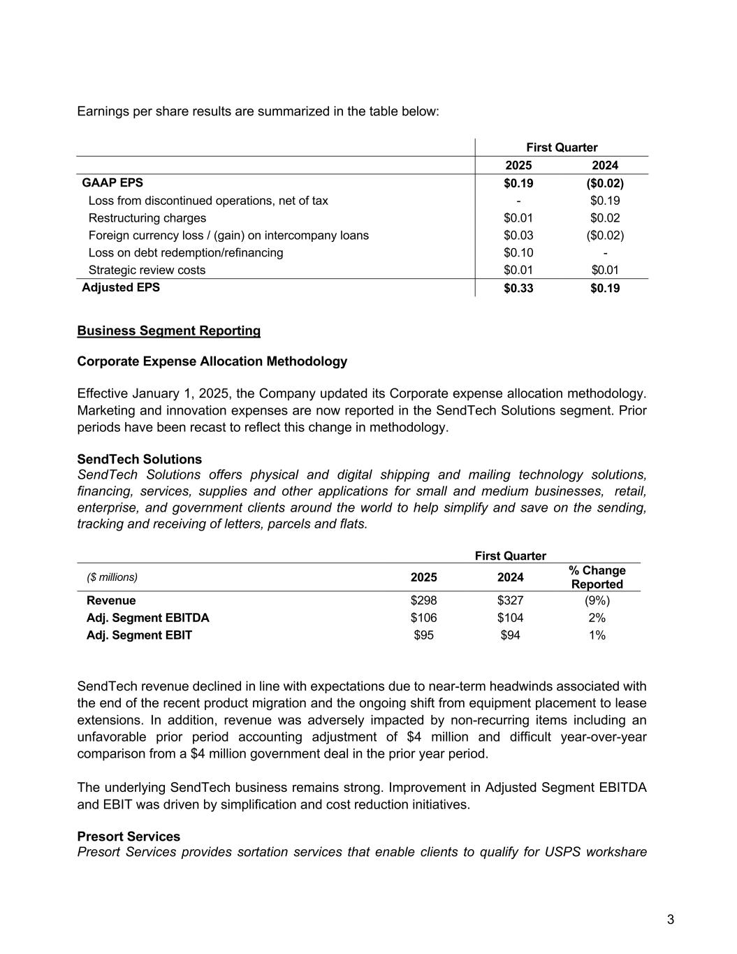 3 Earnings per share results are summarized in the table below: First Quarter 2025 2024 GAAP EPS $0.19 ($0.02) Loss from discontinued operations, net of tax - $0.19 Restructuring charges $0.01 $0.02 Foreign currency loss / (gain) on intercompany loans $0.03 ($0.02) Loss on debt redemption/refinancing $0.10 - Strategic review costs $0.01 $0.01 Adjusted EPS $0.33 $0.19 Business Segment Reporting Corporate Expense Allocation Methodology Effective January 1, 2025, the Company updated its Corporate expense allocation methodology. Marketing and innovation expenses are now reported in the SendTech Solutions segment. Prior periods have been recast to reflect this change in methodology. SendTech Solutions SendTech Solutions offers physical and digital shipping and mailing technology solutions, financing, services, supplies and other applications for small and medium businesses, retail, enterprise, and government clients around the world to help simplify and save on the sending, tracking and receiving of letters, parcels and flats. First Quarter ($ millions) 2025 2024 % Change Reported Revenue $298 $327 (9%) Adj. Segment EBITDA $106 $104 2% Adj. Segment EBIT $95 $94 1% SendTech revenue declined in line with expectations due to near-term headwinds associated with the end of the recent product migration and the ongoing shift from equipment placement to lease extensions. In addition, revenue was adversely impacted by non-recurring items including an unfavorable prior period accounting adjustment of $4 million and difficult year-over-year comparison from a $4 million government deal in the prior year period. The underlying SendTech business remains strong. Improvement in Adjusted Segment EBITDA and EBIT was driven by simplification and cost reduction initiatives. Presort Services Presort Services provides sortation services that enable clients to qualify for USPS workshare