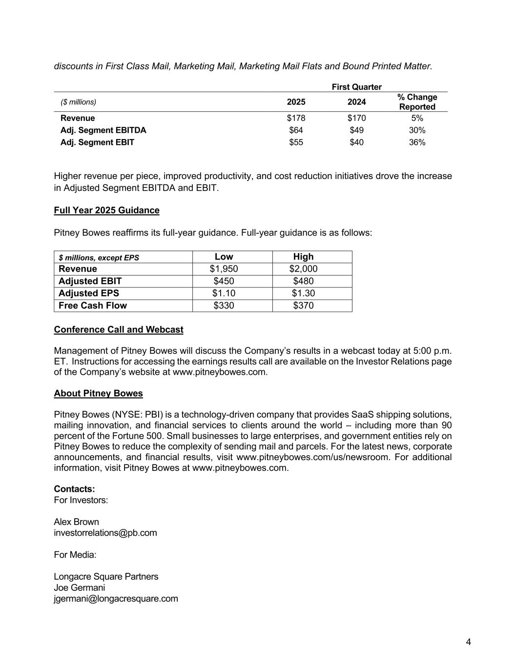 4 discounts in First Class Mail, Marketing Mail, Marketing Mail Flats and Bound Printed Matter. First Quarter ($ millions) 2025 2024 % Change Reported Revenue $178 $170 5% Adj. Segment EBITDA $64 $49 30% Adj. Segment EBIT $55 $40 36% Higher revenue per piece, improved productivity, and cost reduction initiatives drove the increase in Adjusted Segment EBITDA and EBIT. Full Year 2025 Guidance Pitney Bowes reaffirms its full-year guidance. Full-year guidance is as follows: $ millions, except EPS Low High Revenue $1,950 $2,000 Adjusted EBIT $450 $480 Adjusted EPS $1.10 $1.30 Free Cash Flow $330 $370 Conference Call and Webcast Management of Pitney Bowes will discuss the Company’s results in a webcast today at 5:00 p.m. ET. Instructions for accessing the earnings results call are available on the Investor Relations page of the Company’s website at www.pitneybowes.com. About Pitney Bowes Pitney Bowes (NYSE: PBI) is a technology-driven company that provides SaaS shipping solutions, mailing innovation, and financial services to clients around the world – including more than 90 percent of the Fortune 500. Small businesses to large enterprises, and government entities rely on Pitney Bowes to reduce the complexity of sending mail and parcels. For the latest news, corporate announcements, and financial results, visit www.pitneybowes.com/us/newsroom. For additional information, visit Pitney Bowes at www.pitneybowes.com. Contacts: For Investors: Alex Brown investorrelations@pb.com For Media: Longacre Square Partners Joe Germani jgermani@longacresquare.com