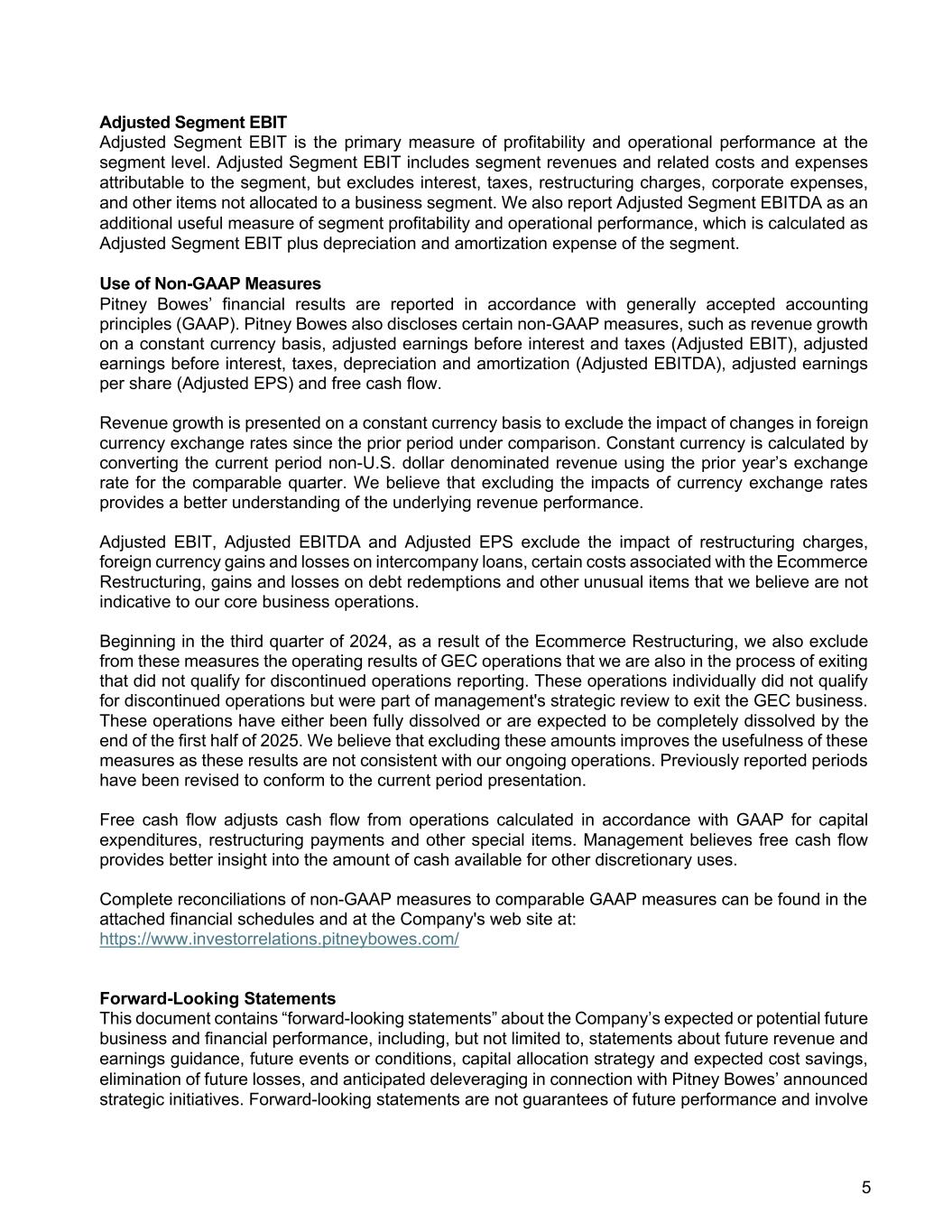 5 Adjusted Segment EBIT Adjusted Segment EBIT is the primary measure of profitability and operational performance at the segment level. Adjusted Segment EBIT includes segment revenues and related costs and expenses attributable to the segment, but excludes interest, taxes, restructuring charges, corporate expenses, and other items not allocated to a business segment. We also report Adjusted Segment EBITDA as an additional useful measure of segment profitability and operational performance, which is calculated as Adjusted Segment EBIT plus depreciation and amortization expense of the segment. Use of Non-GAAP Measures Pitney Bowes’ financial results are reported in accordance with generally accepted accounting principles (GAAP). Pitney Bowes also discloses certain non-GAAP measures, such as revenue growth on a constant currency basis, adjusted earnings before interest and taxes (Adjusted EBIT), adjusted earnings before interest, taxes, depreciation and amortization (Adjusted EBITDA), adjusted earnings per share (Adjusted EPS) and free cash flow. Revenue growth is presented on a constant currency basis to exclude the impact of changes in foreign currency exchange rates since the prior period under comparison. Constant currency is calculated by converting the current period non-U.S. dollar denominated revenue using the prior year’s exchange rate for the comparable quarter. We believe that excluding the impacts of currency exchange rates provides a better understanding of the underlying revenue performance. Adjusted EBIT, Adjusted EBITDA and Adjusted EPS exclude the impact of restructuring charges, foreign currency gains and losses on intercompany loans, certain costs associated with the Ecommerce Restructuring, gains and losses on debt redemptions and other unusual items that we believe are not indicative to our core business operations. Beginning in the third quarter of 2024, as a result of the Ecommerce Restructuring, we also exclude from these measures the operating results of GEC operations that we are also in the process of exiting that did not qualify for discontinued operations reporting. These operations individually did not qualify for discontinued operations but were part of management's strategic review to exit the GEC business. These operations have either been fully dissolved or are expected to be completely dissolved by the end of the first half of 2025. We believe that excluding these amounts improves the usefulness of these measures as these results are not consistent with our ongoing operations. Previously reported periods have been revised to conform to the current period presentation. Free cash flow adjusts cash flow from operations calculated in accordance with GAAP for capital expenditures, restructuring payments and other special items. Management believes free cash flow provides better insight into the amount of cash available for other discretionary uses. Complete reconciliations of non-GAAP measures to comparable GAAP measures can be found in the attached financial schedules and at the Company's web site at: https://www.investorrelations.pitneybowes.com/ Forward-Looking Statements This document contains “forward-looking statements” about the Company’s expected or potential future business and financial performance, including, but not limited to, statements about future revenue and earnings guidance, future events or conditions, capital allocation strategy and expected cost savings, elimination of future losses, and anticipated deleveraging in connection with Pitney Bowes’ announced strategic initiatives. Forward-looking statements are not guarantees of future performance and involve