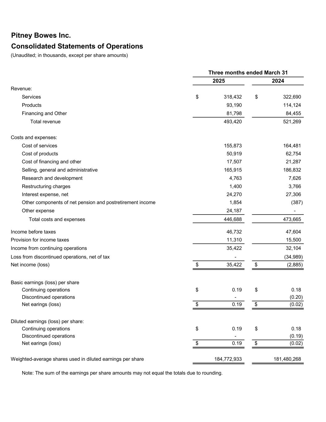Pitney Bowes Inc. Consolidated Statements of Operations (Unaudited; in thousands, except per share amounts) 2025 2024 Revenue: Services 318,432$ 322,690$ Products 93,190 114,124 Financing and Other 81,798 84,455 Total revenue 493,420 521,269 Costs and expenses: Cost of services 155,873 164,481 Cost of products 50,919 62,754 Cost of financing and other 17,507 21,287 Selling, general and administrative 165,915 186,832 Research and development 4,763 7,626 Restructuring charges 1,400 3,766 Interest expense, net 24,270 27,306 Other components of net pension and postretirement income 1,854 (387) Other expense 24,187 - Total costs and expenses 446,688 473,665 Income before taxes 46,732 47,604 Provision for income taxes 11,310 15,500 Income from continuing operations 35,422 32,104 Loss from discontinued operations, net of tax - (34,989) Net income (loss) 35,422$ (2,885)$ Basic earnings (loss) per share Continuing operations 0.19$ 0.18$ Discontinued operations - (0.20) Net earings (loss) 0.19$ (0.02)$ Diluted earnings (loss) per share: Continuing operations 0.19$ 0.18$ Discontinued operations - (0.19) Net earings (loss) 0.19$ (0.02)$ Weighted-average shares used in diluted earnings per share 184,772,933 181,480,268 Note: The sum of the earnings per share amounts may not equal the totals due to rounding. Three months ended March 31