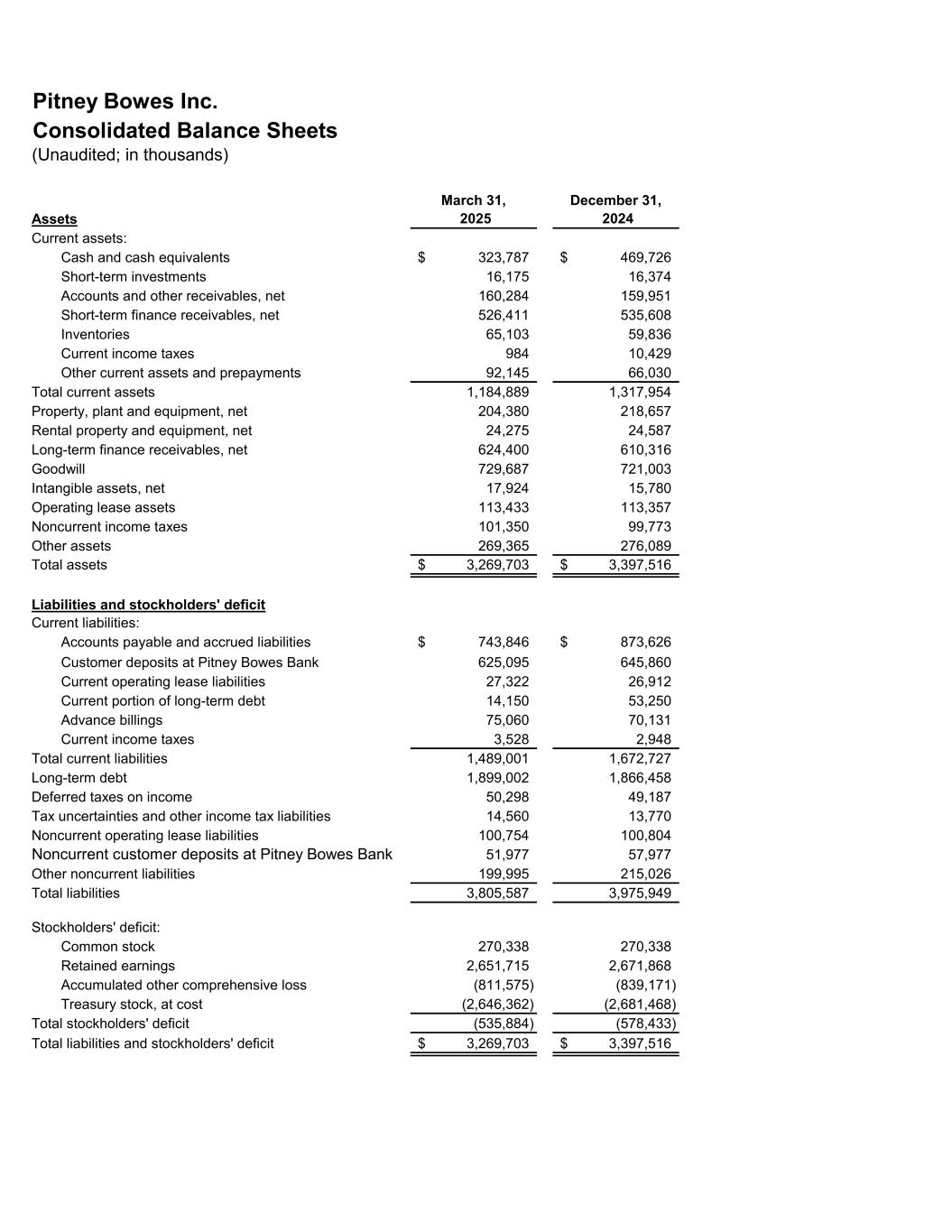 Pitney Bowes Inc. Consolidated Balance Sheets (Unaudited; in thousands) Assets March 31, 2025 December 31, 2024 Current assets: Cash and cash equivalents 323,787$ 469,726$ Short-term investments 16,175 16,374 Accounts and other receivables, net 160,284 159,951 Short-term finance receivables, net 526,411 535,608 Inventories 65,103 59,836 Current income taxes 984 10,429 Other current assets and prepayments 92,145 66,030 Total current assets 1,184,889 1,317,954 Property, plant and equipment, net 204,380 218,657 Rental property and equipment, net 24,275 24,587 Long-term finance receivables, net 624,400 610,316 Goodwill 729,687 721,003 Intangible assets, net 17,924 15,780 Operating lease assets 113,433 113,357 Noncurrent income taxes 101,350 99,773 Other assets 269,365 276,089 Total assets 3,269,703$ 3,397,516$ Liabilities and stockholders' deficit Current liabilities: Accounts payable and accrued liabilities 743,846$ 873,626$ Customer deposits at Pitney Bowes Bank 625,095 645,860 Current operating lease liabilities 27,322 26,912 Current portion of long-term debt 14,150 53,250 Advance billings 75,060 70,131 Current income taxes 3,528 2,948 Total current liabilities 1,489,001 1,672,727 Long-term debt 1,899,002 1,866,458 Deferred taxes on income 50,298 49,187 Tax uncertainties and other income tax liabilities 14,560 13,770 Noncurrent operating lease liabilities 100,754 100,804 Noncurrent customer deposits at Pitney Bowes Bank 51,977 57,977 Other noncurrent liabilities 199,995 215,026 Total liabilities 3,805,587 3,975,949 Stockholders' deficit: Common stock 270,338 270,338 Retained earnings 2,651,715 2,671,868 Accumulated other comprehensive loss (811,575) (839,171) Treasury stock, at cost (2,646,362) (2,681,468) Total stockholders' deficit (535,884) (578,433) Total liabilities and stockholders' deficit 3,269,703$ 3,397,516$