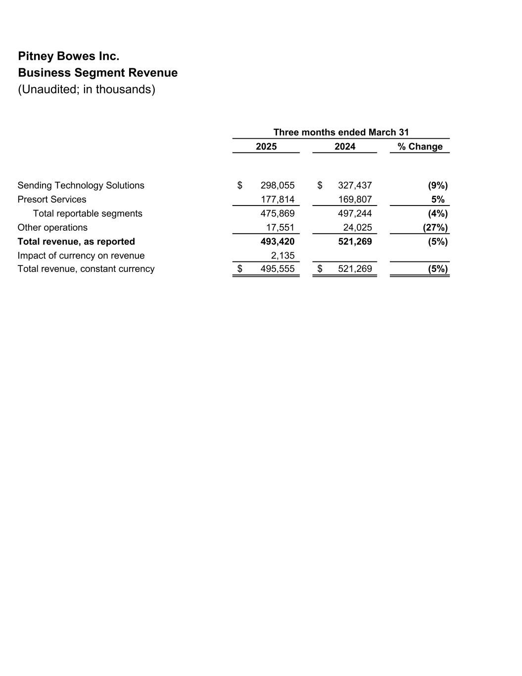 Pitney Bowes Inc. Business Segment Revenue (Unaudited; in thousands) 2025 2024 % Change Sending Technology Solutions 298,055$ 327,437$ (9%) Presort Services 177,814 169,807 5% Total reportable segments 475,869 497,244 (4%) Other operations 17,551 24,025 (27%) Total revenue, as reported 493,420 521,269 (5%) Impact of currency on revenue 2,135 Total revenue, constant currency 495,555$ 521,269$ (5%) Three months ended March 31