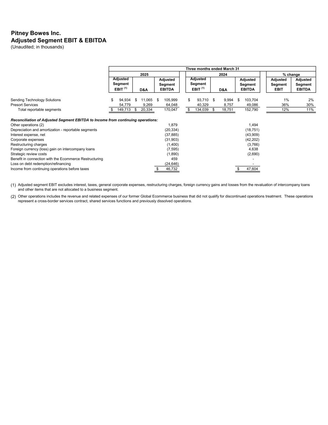 Pitney Bowes Inc. Adjusted Segment EBIT & EBITDA (Unaudited; in thousands) Adjusted Segment EBIT (1) D&A Adjusted Segment EBITDA Adjusted Segment EBIT (1) D&A Adjusted Segment EBITDA Adjusted Segment EBIT Adjusted Segment EBITDA Sending Technology Solutions 94,934$ 11,065$ 105,999$ 93,710$ 9,994$ 103,704$ 1% 2% Presort Services 54,779 9,269 64,048 40,329 8,757 49,086 36% 30% Total reportable segments 149,713$ 20,334$ 170,047 134,039$ 18,751$ 152,790 12% 11% Reconciliation of Adjusted Segment EBITDA to Income from continuing operations: Other operations (2) 1,879 1,494 Depreciation and amortization - reportable segments (20,334) (18,751) Interest expense, net (37,885) (43,909) Corporate expenses (31,903) (42,202) Restructuring charges (1,400) (3,766) Foreign currency (loss) gain on intercompany loans (7,595) 4,638 Strategic review costs (1,890) (2,690) Benefit in connection with the Ecommerce Restructuring 459 - Loss on debt redemption/refinancing (24,646) - Income from continuing operations before taxes 46,732$ 47,604$ (1) (2) Adjusted segment EBIT excludes interest, taxes, general corporate expenses, restructuring charges, foreign currency gains and losses from the revaluation of intercompany loans and other items that are not allocated to a business segment. Other operations includes the revenue and related expenses of our former Global Ecommerce business that did not qualify for discontinued operations treatment. These operations represent a cross-border services contract, shared services functions and previously dissolved operations. Three months ended March 31 2025 2024 % change