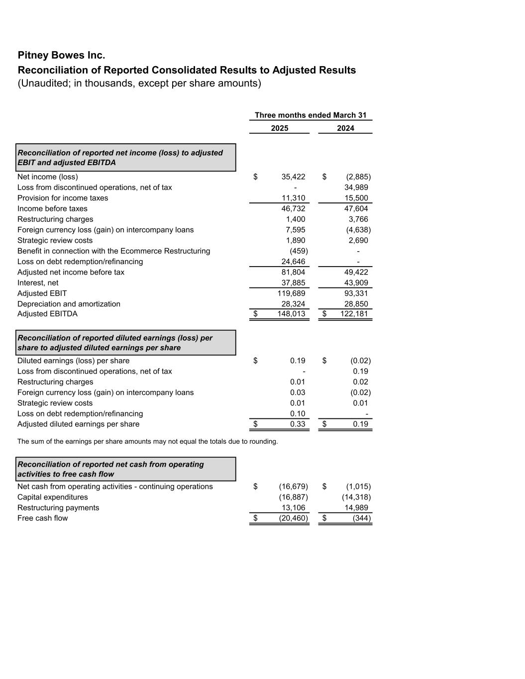Pitney Bowes Inc. Reconciliation of Reported Consolidated Results to Adjusted Results (Unaudited; in thousands, except per share amounts) 2025 2024 Reconciliation of reported net income (loss) to adjusted EBIT and adjusted EBITDA Net income (loss) 35,422$ (2,885)$ Loss from discontinued operations, net of tax - 34,989 Provision for income taxes 11,310 15,500 Income before taxes 46,732 47,604 Restructuring charges 1,400 3,766 Foreign currency loss (gain) on intercompany loans 7,595 (4,638) Strategic review costs 1,890 2,690 Benefit in connection with the Ecommerce Restructuring (459) - Loss on debt redemption/refinancing 24,646 - Adjusted net income before tax 81,804 49,422 Interest, net 37,885 43,909 Adjusted EBIT 119,689 93,331 Depreciation and amortization 28,324 28,850 Adjusted EBITDA 148,013$ 122,181$ Reconciliation of reported diluted earnings (loss) per share to adjusted diluted earnings per share Diluted earnings (loss) per share 0.19$ (0.02)$ Loss from discontinued operations, net of tax - 0.19 Restructuring charges 0.01 0.02 Foreign currency loss (gain) on intercompany loans 0.03 (0.02) Strategic review costs 0.01 0.01 Loss on debt redemption/refinancing 0.10 - Adjusted diluted earnings per share 0.33$ 0.19$ The sum of the earnings per share amounts may not equal the totals due to rounding. Reconciliation of reported net cash from operating activities to free cash flow Net cash from operating activities - continuing operations (16,679)$ (1,015)$ Capital expenditures (16,887) (14,318) Restructuring payments 13,106 14,989 Free cash flow (20,460)$ (344)$ Three months ended March 31