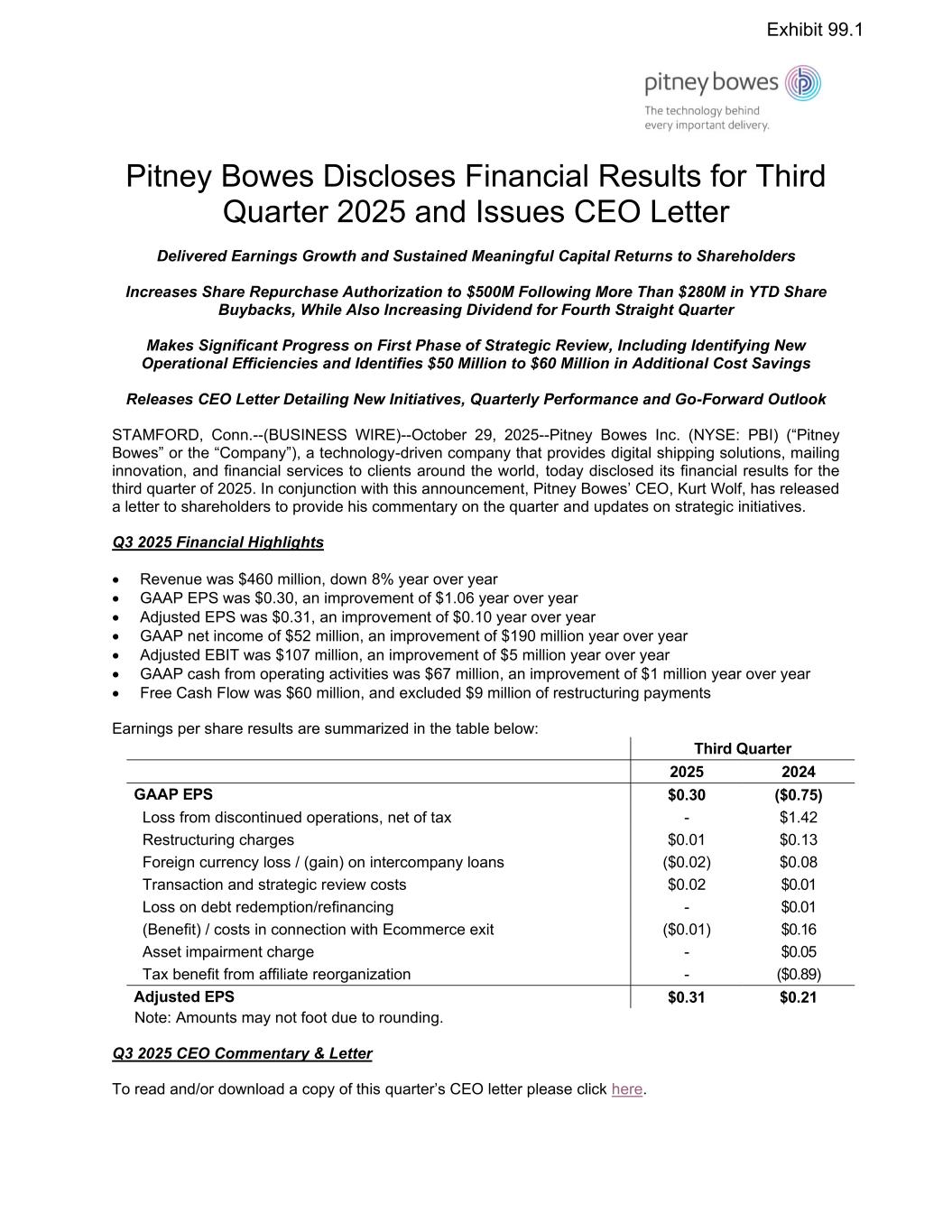 Pitney Bowes Discloses Financial Results for Third Quarter 2025 and Issues CEO Letter Delivered Earnings Growth and Sustained Meaningful Capital Returns to Shareholders Increases Share Repurchase Authorization to $500M Following More Than $280M in YTD Share Buybacks, While Also Increasing Dividend for Fourth Straight Quarter Makes Significant Progress on First Phase of Strategic Review, Including Identifying New Operational Efficiencies and Identifies $50 Million to $60 Million in Additional Cost Savings Releases CEO Letter Detailing New Initiatives, Quarterly Performance and Go-Forward Outlook STAMFORD, Conn.--(BUSINESS WIRE)--October 29, 2025--Pitney Bowes Inc. (NYSE: PBI) (“Pitney Bowes” or the “Company”), a technology-driven company that provides digital shipping solutions, mailing innovation, and financial services to clients around the world, today disclosed its financial results for the third quarter of 2025. In conjunction with this announcement, Pitney Bowes’ CEO, Kurt Wolf, has released a letter to shareholders to provide his commentary on the quarter and updates on strategic initiatives. Q3 2025 Financial Highlights • Revenue was $460 million, down 8% year over year • GAAP EPS was $0.30, an improvement of $1.06 year over year • Adjusted EPS was $0.31, an improvement of $0.10 year over year • GAAP net income of $52 million, an improvement of $190 million year over year • Adjusted EBIT was $107 million, an improvement of $5 million year over year • GAAP cash from operating activities was $67 million, an improvement of $1 million year over year • Free Cash Flow was $60 million, and excluded $9 million of restructuring payments Earnings per share results are summarized in the table below: Third Quarter 2025 2024 GAAP EPS $0.30 ($0.75) Loss from discontinued operations, net of tax - $1.42 Restructuring charges $0.01 $0.13 Foreign currency loss / (gain) on intercompany loans ($0.02) $0.08 Transaction and strategic review costs $0.02 $0.01 Loss on debt redemption/refinancing - $0.01 (Benefit) / costs in connection with Ecommerce exit ($0.01) $0.16 Asset impairment charge - $0.05 Tax benefit from affiliate reorganization - ($0.89) Adjusted EPS $0.31 $0.21 Note: Amounts may not foot due to rounding. Q3 2025 CEO Commentary & Letter To read and/or download a copy of this quarter’s CEO letter please click here. Exhibit 99.1
