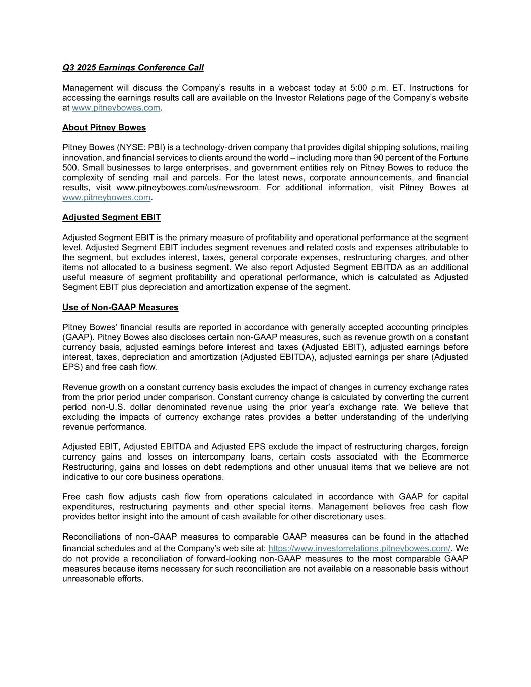 Q3 2025 Earnings Conference Call Management will discuss the Company’s results in a webcast today at 5:00 p.m. ET. Instructions for accessing the earnings results call are available on the Investor Relations page of the Company’s website at www.pitneybowes.com. About Pitney Bowes Pitney Bowes (NYSE: PBI) is a technology-driven company that provides digital shipping solutions, mailing innovation, and financial services to clients around the world – including more than 90 percent of the Fortune 500. Small businesses to large enterprises, and government entities rely on Pitney Bowes to reduce the complexity of sending mail and parcels. For the latest news, corporate announcements, and financial results, visit www.pitneybowes.com/us/newsroom. For additional information, visit Pitney Bowes at www.pitneybowes.com. Adjusted Segment EBIT Adjusted Segment EBIT is the primary measure of profitability and operational performance at the segment level. Adjusted Segment EBIT includes segment revenues and related costs and expenses attributable to the segment, but excludes interest, taxes, general corporate expenses, restructuring charges, and other items not allocated to a business segment. We also report Adjusted Segment EBITDA as an additional useful measure of segment profitability and operational performance, which is calculated as Adjusted Segment EBIT plus depreciation and amortization expense of the segment. Use of Non-GAAP Measures Pitney Bowes’ financial results are reported in accordance with generally accepted accounting principles (GAAP). Pitney Bowes also discloses certain non-GAAP measures, such as revenue growth on a constant currency basis, adjusted earnings before interest and taxes (Adjusted EBIT), adjusted earnings before interest, taxes, depreciation and amortization (Adjusted EBITDA), adjusted earnings per share (Adjusted EPS) and free cash flow. Revenue growth on a constant currency basis excludes the impact of changes in currency exchange rates from the prior period under comparison. Constant currency change is calculated by converting the current period non-U.S. dollar denominated revenue using the prior year’s exchange rate. We believe that excluding the impacts of currency exchange rates provides a better understanding of the underlying revenue performance. Adjusted EBIT, Adjusted EBITDA and Adjusted EPS exclude the impact of restructuring charges, foreign currency gains and losses on intercompany loans, certain costs associated with the Ecommerce Restructuring, gains and losses on debt redemptions and other unusual items that we believe are not indicative to our core business operations. Free cash flow adjusts cash flow from operations calculated in accordance with GAAP for capital expenditures, restructuring payments and other special items. Management believes free cash flow provides better insight into the amount of cash available for other discretionary uses. Reconciliations of non-GAAP measures to comparable GAAP measures can be found in the attached financial schedules and at the Company's web site at: https://www.investorrelations.pitneybowes.com/. We do not provide a reconciliation of forward‑looking non‑GAAP measures to the most comparable GAAP measures because items necessary for such reconciliation are not available on a reasonable basis without unreasonable efforts.