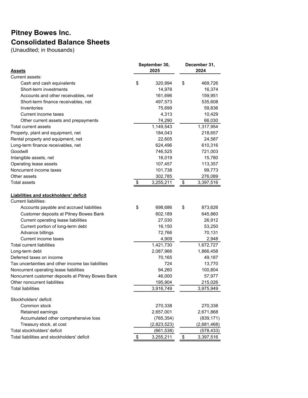 Pitney Bowes Inc. Consolidated Balance Sheets (Unaudited; in thousands) Assets September 30, 2025 December 31, 2024 Current assets: Cash and cash equivalents 320,994$ 469,726$ Short-term investments 14,978 16,374 Accounts and other receivables, net 161,696 159,951 Short-term finance receivables, net 497,573 535,608 Inventories 75,699 59,836 Current income taxes 4,313 10,429 Other current assets and prepayments 74,290 66,030 Total current assets 1,149,543 1,317,954 Property, plant and equipment, net 184,043 218,657 Rental property and equipment, net 22,605 24,587 Long-term finance receivables, net 624,496 610,316 Goodwill 746,525 721,003 Intangible assets, net 16,019 15,780 Operating lease assets 107,457 113,357 Noncurrent income taxes 101,738 99,773 Other assets 302,785 276,089 Total assets 3,255,211$ 3,397,516$ Liabilities and stockholders' deficit Current liabilities: Accounts payable and accrued liabilities 698,686$ 873,626$ Customer deposits at Pitney Bowes Bank 602,189 645,860 Current operating lease liabilities 27,030 26,912 Current portion of long-term debt 16,150 53,250 Advance billings 72,766 70,131 Current income taxes 4,909 2,948 Total current liabilities 1,421,730 1,672,727 Long-term debt 2,087,966 1,866,458 Deferred taxes on income 70,165 49,187 Tax uncertainties and other income tax liabilities 724 13,770 Noncurrent operating lease liabilities 94,260 100,804 Noncurrent customer deposits at Pitney Bowes Bank 46,000 57,977 Other noncurrent liabilities 195,904 215,026 Total liabilities 3,916,749 3,975,949 Stockholders' deficit: Common stock 270,338 270,338 Retained earnings 2,657,001 2,671,868 Accumulated other comprehensive loss (765,354) (839,171) Treasury stock, at cost (2,823,523) (2,681,468) Total stockholders' deficit (661,538) (578,433) Total liabilities and stockholders' deficit 3,255,211$ 3,397,516$