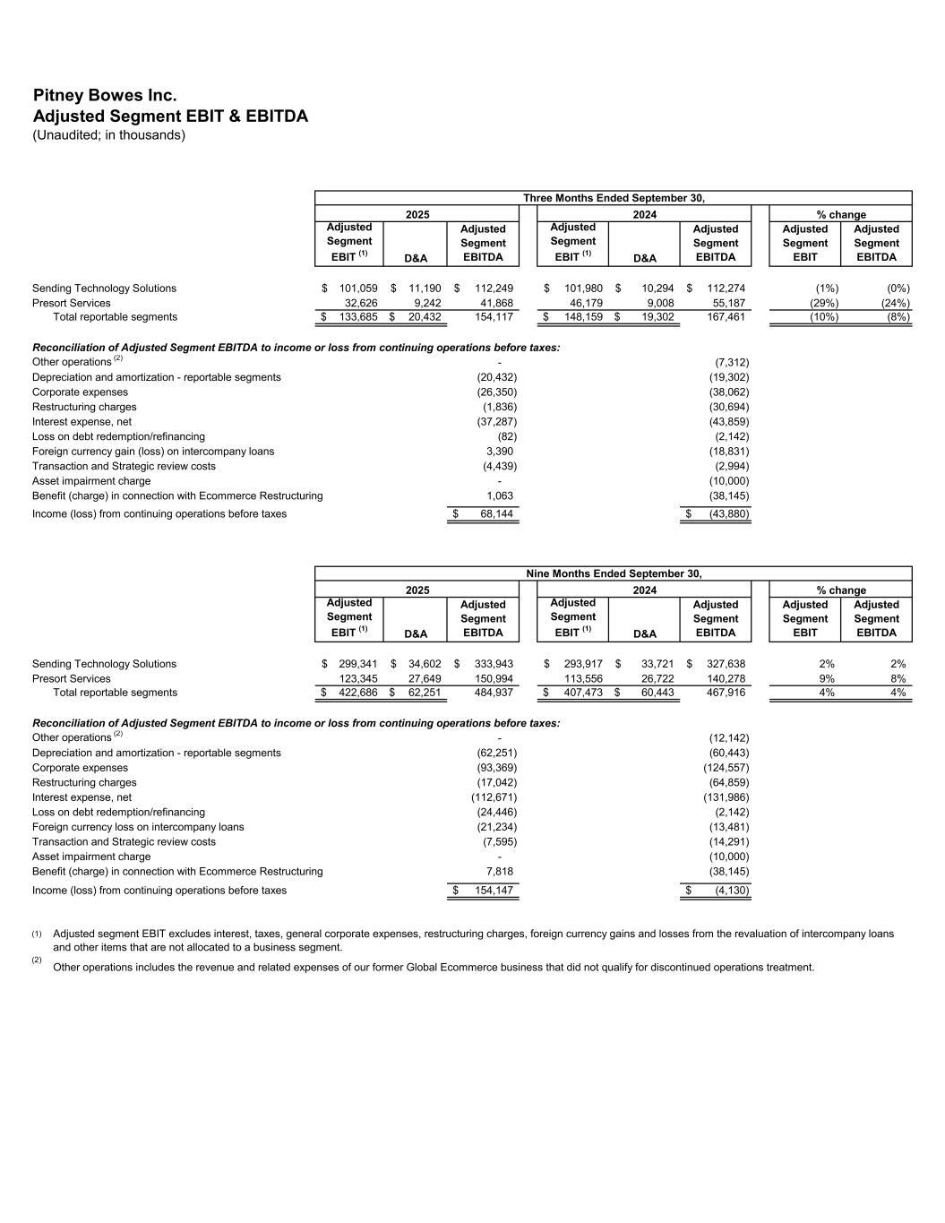 Pitney Bowes Inc. Adjusted Segment EBIT & EBITDA (Unaudited; in thousands) Adjusted Segment EBIT (1) D&A Adjusted Segment EBITDA Adjusted Segment EBIT (1) D&A Adjusted Segment EBITDA Adjusted Segment EBIT Adjusted Segment EBITDA Sending Technology Solutions 101,059$ 11,190$ 112,249$ 101,980$ 10,294$ 112,274$ (1%) (0%) Presort Services 32,626 9,242 41,868 46,179 9,008 55,187 (29%) (24%) Total reportable segments 133,685$ 20,432$ 154,117 148,159$ 19,302$ 167,461 (10%) (8%) Reconciliation of Adjusted Segment EBITDA to income or loss from continuing operations before taxes: Other operations (2) - (7,312) Depreciation and amortization - reportable segments (20,432) (19,302) Corporate expenses (26,350) (38,062) Restructuring charges (1,836) (30,694) Interest expense, net (37,287) (43,859) Loss on debt redemption/refinancing (82) (2,142) Foreign currency gain (loss) on intercompany loans 3,390 (18,831) Transaction and Strategic review costs (4,439) (2,994) Asset impairment charge - (10,000) Benefit (charge) in connection with Ecommerce Restructuring 1,063 (38,145) Income (loss) from continuing operations before taxes 68,144$ (43,880)$ Adjusted Segment EBIT (1) D&A Adjusted Segment EBITDA Adjusted Segment EBIT (1) D&A Adjusted Segment EBITDA Adjusted Segment EBIT Adjusted Segment EBITDA Sending Technology Solutions 299,341$ 34,602$ 333,943$ 293,917$ 33,721$ 327,638$ 2% 2% Presort Services 123,345 27,649 150,994 113,556 26,722 140,278 9% 8% Total reportable segments 422,686$ 62,251$ 484,937 407,473$ 60,443$ 467,916 4% 4% Reconciliation of Adjusted Segment EBITDA to income or loss from continuing operations before taxes: Other operations (2) - (12,142) Depreciation and amortization - reportable segments (62,251) (60,443) Corporate expenses (93,369) (124,557) Restructuring charges (17,042) (64,859) Interest expense, net (112,671) (131,986) Loss on debt redemption/refinancing (24,446) (2,142) Foreign currency loss on intercompany loans (21,234) (13,481) Transaction and Strategic review costs (7,595) (14,291) Asset impairment charge - (10,000) Benefit (charge) in connection with Ecommerce Restructuring 7,818 (38,145) Income (loss) from continuing operations before taxes 154,147$ (4,130)$ (1) (2) Adjusted segment EBIT excludes interest, taxes, general corporate expenses, restructuring charges, foreign currency gains and losses from the revaluation of intercompany loans and other items that are not allocated to a business segment. Other operations includes the revenue and related expenses of our former Global Ecommerce business that did not qualify for discontinued operations treatment. Three Months Ended September 30, 2025 2024 Nine Months Ended September 30, 2025 2024 % change % change