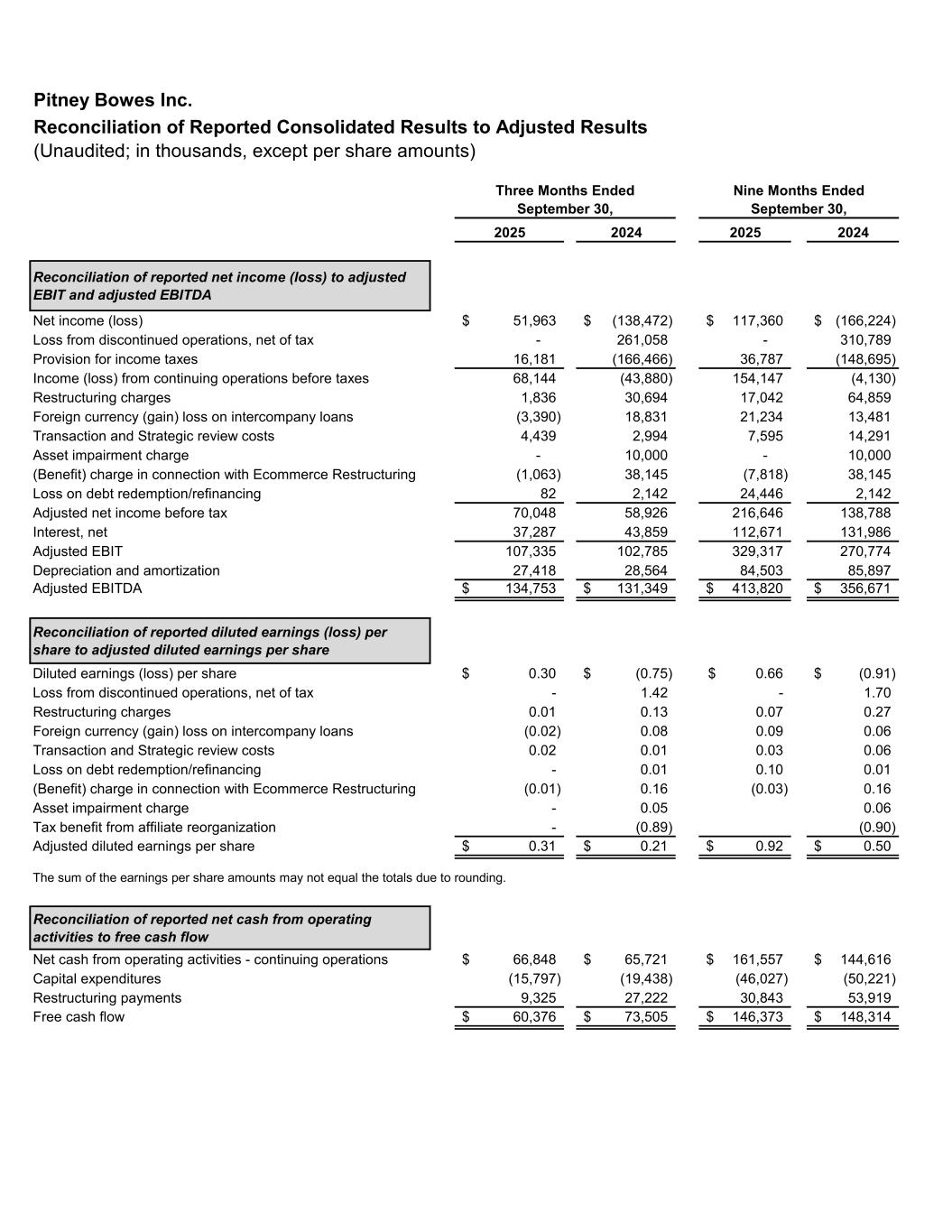 Pitney Bowes Inc. Reconciliation of Reported Consolidated Results to Adjusted Results (Unaudited; in thousands, except per share amounts) 2025 2024 2025 2024 Reconciliation of reported net income (loss) to adjusted EBIT and adjusted EBITDA Net income (loss) 51,963$ (138,472)$ 117,360$ (166,224)$ Loss from discontinued operations, net of tax - 261,058 - 310,789 Provision for income taxes 16,181 (166,466) 36,787 (148,695) Income (loss) from continuing operations before taxes 68,144 (43,880) 154,147 (4,130) Restructuring charges 1,836 30,694 17,042 64,859 Foreign currency (gain) loss on intercompany loans (3,390) 18,831 21,234 13,481 Transaction and Strategic review costs 4,439 2,994 7,595 14,291 Asset impairment charge - 10,000 - 10,000 (Benefit) charge in connection with Ecommerce Restructuring (1,063) 38,145 (7,818) 38,145 Loss on debt redemption/refinancing 82 2,142 24,446 2,142 Adjusted net income before tax 70,048 58,926 216,646 138,788 Interest, net 37,287 43,859 112,671 131,986 Adjusted EBIT 107,335 102,785 329,317 270,774 Depreciation and amortization 27,418 28,564 84,503 85,897 Adjusted EBITDA 134,753$ 131,349$ 413,820$ 356,671$ Reconciliation of reported diluted earnings (loss) per share to adjusted diluted earnings per share Diluted earnings (loss) per share 0.30$ (0.75)$ 0.66$ (0.91)$ Loss from discontinued operations, net of tax - 1.42 - 1.70 Restructuring charges 0.01 0.13 0.07 0.27 Foreign currency (gain) loss on intercompany loans (0.02) 0.08 0.09 0.06 Transaction and Strategic review costs 0.02 0.01 0.03 0.06 Loss on debt redemption/refinancing - 0.01 0.10 0.01 (Benefit) charge in connection with Ecommerce Restructuring (0.01) 0.16 (0.03) 0.16 Asset impairment charge - 0.05 0.06 Tax benefit from affiliate reorganization - (0.89) (0.90) Adjusted diluted earnings per share 0.31$ 0.21$ 0.92$ 0.50$ The sum of the earnings per share amounts may not equal the totals due to rounding. Reconciliation of reported net cash from operating activities to free cash flow Net cash from operating activities - continuing operations 66,848$ 65,721$ 161,557$ 144,616$ Capital expenditures (15,797) (19,438) (46,027) (50,221) Restructuring payments 9,325 27,222 30,843 53,919 Free cash flow 60,376$ 73,505$ 146,373$ 148,314$ Three Months Ended September 30, Nine Months Ended September 30,