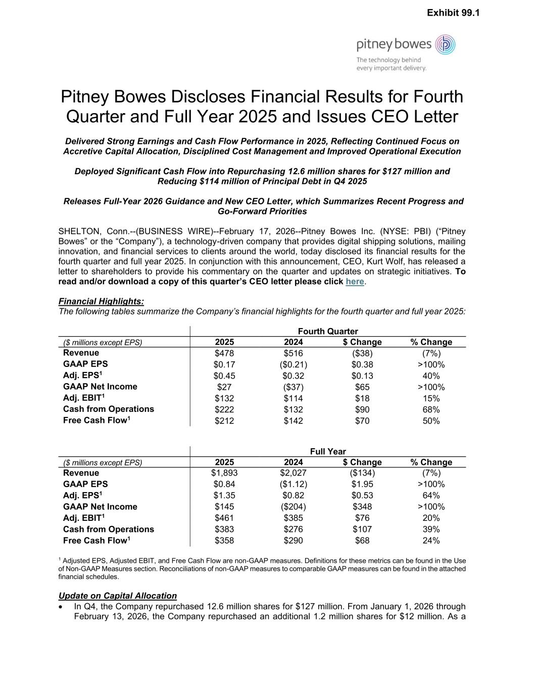 Pitney Bowes Discloses Financial Results for Fourth Quarter and Full Year 2025 and Issues CEO Letter Delivered Strong Earnings and Cash Flow Performance in 2025, Reflecting Continued Focus on Accretive Capital Allocation, Disciplined Cost Management and Improved Operational Execution Deployed Significant Cash Flow into Repurchasing 12.6 million shares for $127 million and Reducing $114 million of Principal Debt in Q4 2025 Releases Full-Year 2026 Guidance and New CEO Letter, which Summarizes Recent Progress and Go-Forward Priorities SHELTON, Conn.--(BUSINESS WIRE)--February 17, 2026--Pitney Bowes Inc. (NYSE: PBI) (“Pitney Bowes” or the “Company”), a technology-driven company that provides digital shipping solutions, mailing innovation, and financial services to clients around the world, today disclosed its financial results for the fourth quarter and full year 2025. In conjunction with this announcement, CEO, Kurt Wolf, has released a letter to shareholders to provide his commentary on the quarter and updates on strategic initiatives. To read and/or download a copy of this quarter’s CEO letter please click here. Financial Highlights: The following tables summarize the Company’s financial highlights for the fourth quarter and full year 2025: Fourth Quarter ($ millions except EPS) 2025 2024 $ Change % Change Revenue $478 $516 ($38) (7%) GAAP EPS $0.17 ($0.21) $0.38 >100% Adj. EPS1 $0.45 $0.32 $0.13 40% GAAP Net Income $27 ($37) $65 >100% Adj. EBIT1 $132 $114 $18 15% Cash from Operations $222 $132 $90 68% Free Cash Flow1 $212 $142 $70 50% Full Year ($ millions except EPS) 2025 2024 $ Change % Change Revenue $1,893 $2,027 ($134) (7%) GAAP EPS $0.84 ($1.12) $1.95 >100% Adj. EPS1 $1.35 $0.82 $0.53 64% GAAP Net Income $145 ($204) $348 >100% Adj. EBIT1 $461 $385 $76 20% Cash from Operations $383 $276 $107 39% Free Cash Flow1 $358 $290 $68 24% 1 Adjusted EPS, Adjusted EBIT, and Free Cash Flow are non-GAAP measures. Definitions for these metrics can be found in the Use of Non-GAAP Measures section. Reconciliations of non-GAAP measures to comparable GAAP measures can be found in the attached financial schedules. Update on Capital Allocation Exhibit 99.1 • In Q4, the Company repurchased 12.6 million shares for $127 million. From January 1, 2026 through February 13, 2026, the Company repurchased an additional 1.2 million shares for $12 million. As a