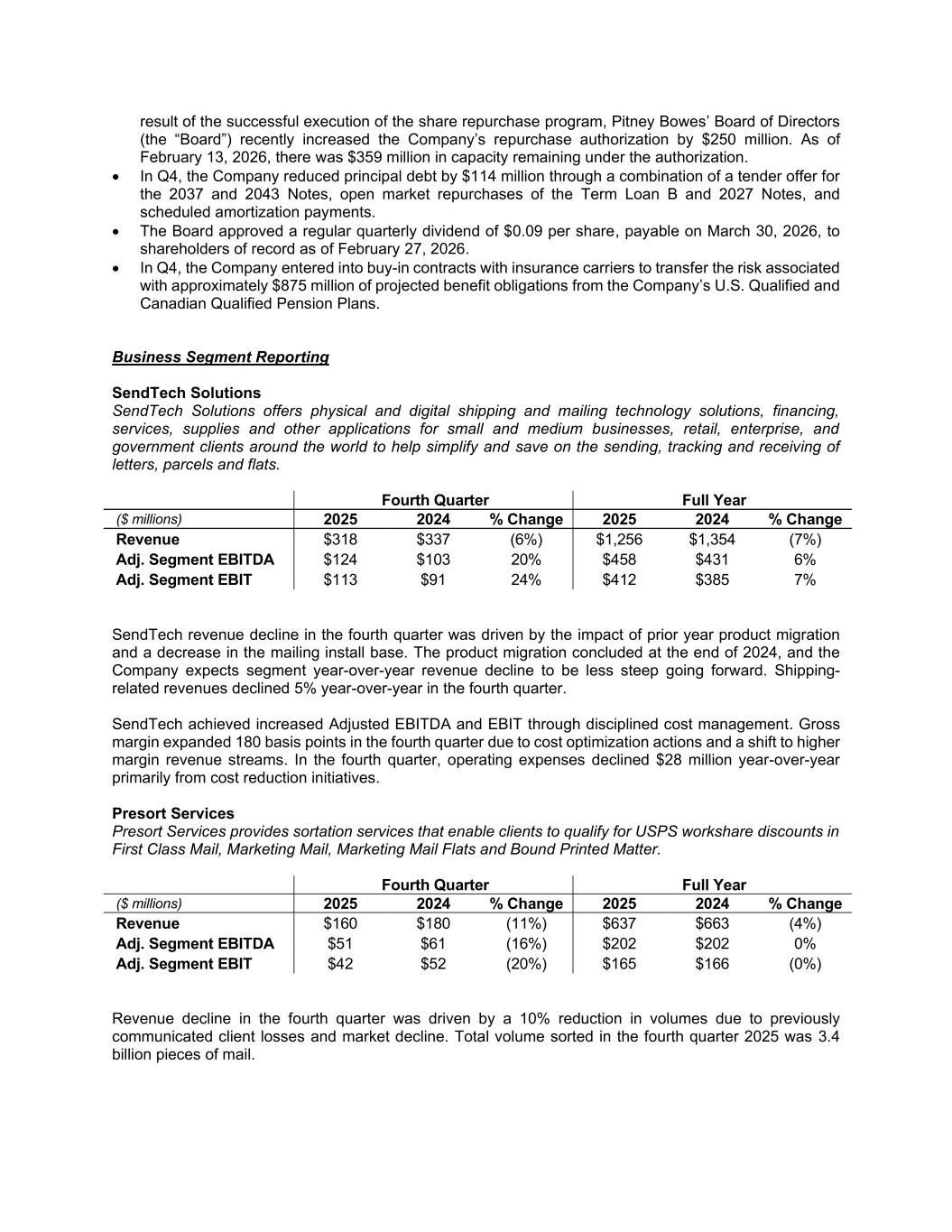 Business Segment Reporting SendTech Solutions SendTech Solutions offers physical and digital shipping and mailing technology solutions, financing, services, supplies and other applications for small and medium businesses, retail, enterprise, and government clients around the world to help simplify and save on the sending, tracking and receiving of letters, parcels and flats. Fourth Quarter Full Year ($ millions) 2025 2024 % Change 2025 2024 % Change Revenue $318 $337 (6%) $1,256 $1,354 (7%) Adj. Segment EBITDA $124 $103 20% $458 $431 6% Adj. Segment EBIT $113 $91 24% $412 $385 7% SendTech revenue decline in the fourth quarter was driven by the impact of prior year product migration and a decrease in the mailing install base. The product migration concluded at the end of 2024, and the Company expects segment year-over-year revenue decline to be less steep going forward. Shipping- related revenues declined 5% year-over-year in the fourth quarter. SendTech achieved increased Adjusted EBITDA and EBIT through disciplined cost management. Gross margin expanded 180 basis points in the fourth quarter due to cost optimization actions and a shift to higher margin revenue streams. In the fourth quarter, operating expenses declined $28 million year-over-year primarily from cost reduction initiatives. Presort Services Presort Services provides sortation services that enable clients to qualify for USPS workshare discounts in First Class Mail, Marketing Mail, Marketing Mail Flats and Bound Printed Matter. Fourth Quarter Full Year ($ millions) 2025 2024 % Change 2025 2024 % Change Revenue $160 $180 (11%) $637 $663 (4%) Adj. Segment EBITDA $51 $61 (16%) $202 $202 0% Adj. Segment EBIT $42 $52 (20%) $165 $166 (0%) Revenue decline in the fourth quarter was driven by a 10% reduction in volumes due to previously communicated client losses and market decline. Total volume sorted in the fourth quarter 2025 was 3.4 billion pieces of mail. result of the successful execution of the share repurchase program, Pitney Bowes’ Board of Directors (the “Board”) recently increased the Company’s repurchase authorization by $250 million. As of February 13, 2026, there was $359 million in capacity remaining under the authorization. • In Q4, the Company reduced principal debt by $114 million through a combination of a tender offer for the 2037 and 2043 Notes, open market repurchases of the Term Loan B and 2027 Notes, and scheduled amortization payments. • The Board approved a regular quarterly dividend of $0.09 per share, payable on March 30, 2026, to shareholders of record as of February 27, 2026. • In Q4, the Company entered into buy-in contracts with insurance carriers to transfer the risk associated with approximately $875 million of projected benefit obligations from the Company’s U.S. Qualified and Canadian Qualified Pension Plans.