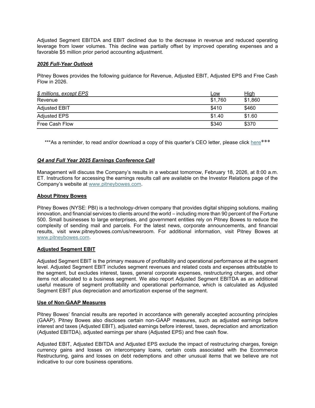 Adjusted Segment EBITDA and EBIT declined due to the decrease in revenue and reduced operating leverage from lower volumes. This decline was partially offset by improved operating expenses and a favorable $5 million prior period accounting adjustment. 2026 Full-Year Outlook Pitney Bowes provides the following guidance for Revenue, Adjusted EBIT, Adjusted EPS and Free Cash Flow in 2026. $ millions, except EPS Low High Revenue $1,760 $1,860 Adjusted EBIT $410 $460 Adjusted EPS $1.40 $1.60 Free Cash Flow $340 $370 ***As a reminder, to read and/or download a copy of this quarter’s CEO letter, please click here*** Q4 and Full Year 2025 Earnings Conference Call Management will discuss the Company’s results in a webcast tomorrow, February 18, 2026, at 8:00 a.m. ET. Instructions for accessing the earnings results call are available on the Investor Relations page of the Company’s website at www.pitneybowes.com. About Pitney Bowes Pitney Bowes (NYSE: PBI) is a technology-driven company that provides digital shipping solutions, mailing innovation, and financial services to clients around the world – including more than 90 percent of the Fortune 500. Small businesses to large enterprises, and government entities rely on Pitney Bowes to reduce the complexity of sending mail and parcels. For the latest news, corporate announcements, and financial results, visit www.pitneybowes.com/us/newsroom. For additional information, visit Pitney Bowes at www.pitneybowes.com. Adjusted Segment EBIT Adjusted Segment EBIT is the primary measure of profitability and operational performance at the segment level. Adjusted Segment EBIT includes segment revenues and related costs and expenses attributable to the segment, but excludes interest, taxes, general corporate expenses, restructuring charges, and other items not allocated to a business segment. We also report Adjusted Segment EBITDA as an additional useful measure of segment profitability and operational performance, which is calculated as Adjusted Segment EBIT plus depreciation and amortization expense of the segment. Use of Non-GAAP Measures Pitney Bowes’ financial results are reported in accordance with generally accepted accounting principles (GAAP). Pitney Bowes also discloses certain non-GAAP measures, such as adjusted earnings before interest and taxes (Adjusted EBIT), adjusted earnings before interest, taxes, depreciation and amortization (Adjusted EBITDA), adjusted earnings per share (Adjusted EPS) and free cash flow. Adjusted EBIT, Adjusted EBITDA and Adjusted EPS exclude the impact of restructuring charges, foreign currency gains and losses on intercompany loans, certain costs associated with the Ecommerce Restructuring, gains and losses on debt redemptions and other unusual items that we believe are not indicative to our core business operations.