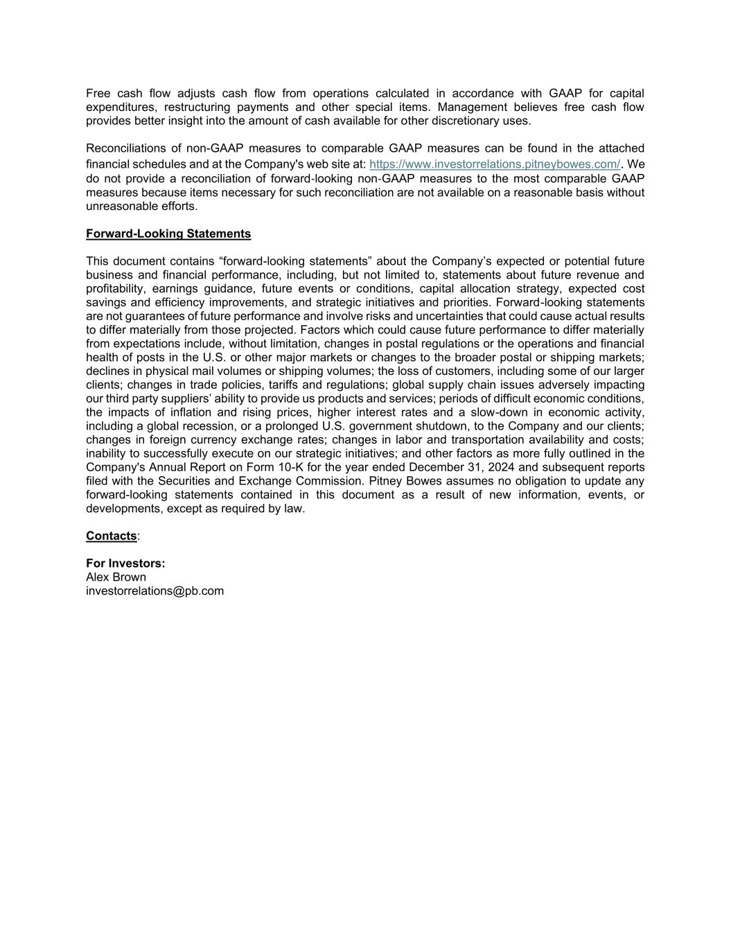 Free cash flow adjusts cash flow from operations calculated in accordance with GAAP for capital expenditures, restructuring payments and other special items. Management believes free cash flow provides better insight into the amount of cash available for other discretionary uses. Reconciliations of non-GAAP measures to comparable GAAP measures can be found in the attached financial schedules and at the Company's web site at: https://www.investorrelations.pitneybowes.com/. We do not provide a reconciliation of forward‑looking non‑GAAP measures to the most comparable GAAP measures because items necessary for such reconciliation are not available on a reasonable basis without unreasonable efforts. Forward-Looking Statements This document contains “forward-looking statements” about the Company’s expected or potential future business and financial performance, including, but not limited to, statements about future revenue and profitability, earnings guidance, future events or conditions, capital allocation strategy, expected cost savings and efficiency improvements, and strategic initiatives and priorities. Forward-looking statements are not guarantees of future performance and involve risks and uncertainties that could cause actual results to differ materially from those projected. Factors which could cause future performance to differ materially from expectations include, without limitation, changes in postal regulations or the operations and financial health of posts in the U.S. or other major markets or changes to the broader postal or shipping markets; declines in physical mail volumes or shipping volumes; the loss of customers, including some of our larger clients; changes in trade policies, tariffs and regulations; global supply chain issues adversely impacting our third party suppliers’ ability to provide us products and services; periods of difficult economic conditions, the impacts of inflation and rising prices, higher interest rates and a slow-down in economic activity, including a global recession, or a prolonged U.S. government shutdown, to the Company and our clients; changes in foreign currency exchange rates; changes in labor and transportation availability and costs; inability to successfully execute on our strategic initiatives; and other factors as more fully outlined in the Company's Annual Report on Form 10-K for the year ended December 31, 2024 and subsequent reports filed with the Securities and Exchange Commission. Pitney Bowes assumes no obligation to update any forward-looking statements contained in this document as a result of new information, events, or developments, except as required by law. Contacts: For Investors: Alex Brown investorrelations@pb.com