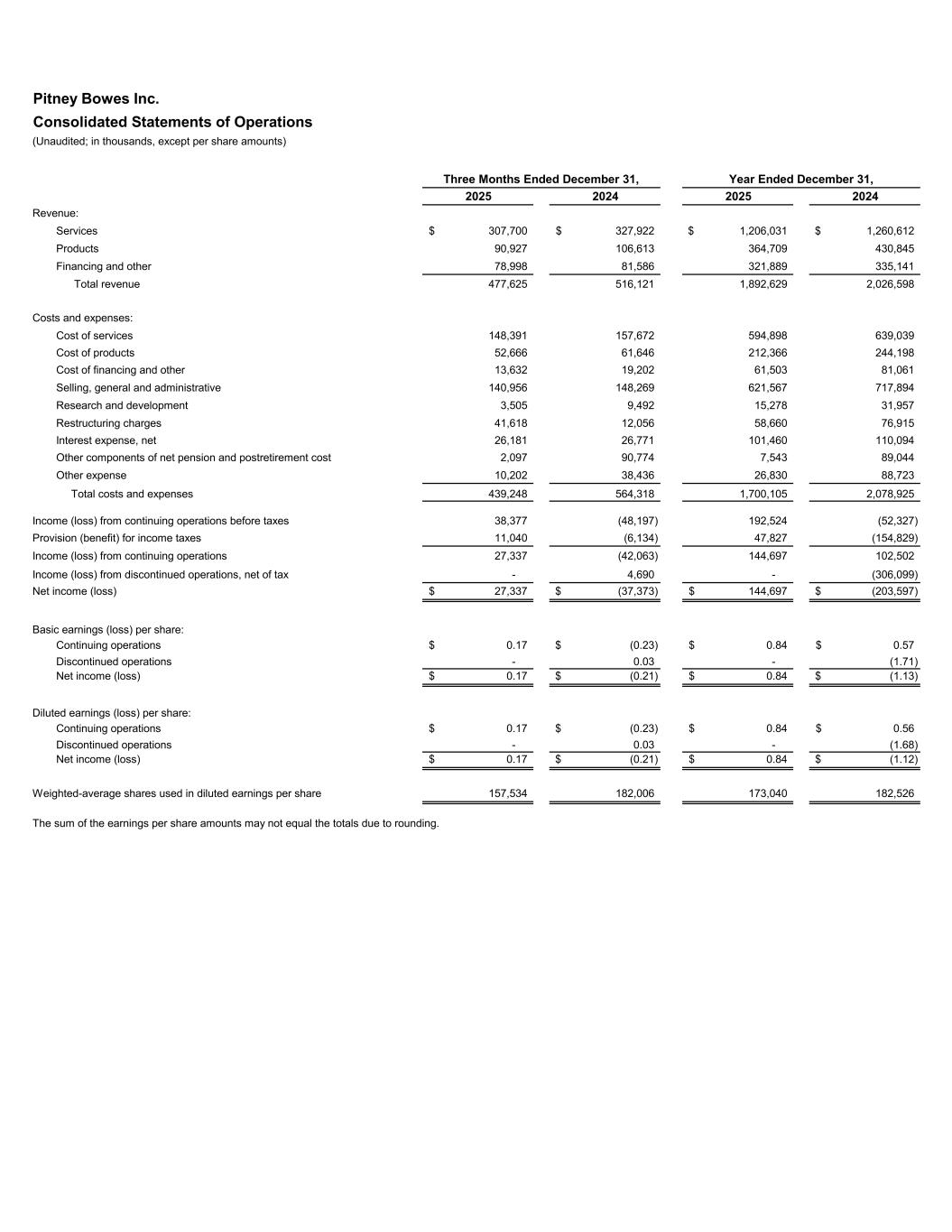 Pitney Bowes Inc. Consolidated Statements of Operations (Unaudited; in thousands, except per share amounts) 2025 2024 2025 2024 Revenue: Services 307,700$ 327,922$ 1,206,031$ 1,260,612$ Products 90,927 106,613 364,709 430,845 Financing and other 78,998 81,586 321,889 335,141 Total revenue 477,625 516,121 1,892,629 2,026,598 Costs and expenses: Cost of services 148,391 157,672 594,898 639,039 Cost of products 52,666 61,646 212,366 244,198 Cost of financing and other 13,632 19,202 61,503 81,061 Selling, general and administrative 140,956 148,269 621,567 717,894 Research and development 3,505 9,492 15,278 31,957 Restructuring charges 41,618 12,056 58,660 76,915 Interest expense, net 26,181 26,771 101,460 110,094 Other components of net pension and postretirement cost 2,097 90,774 7,543 89,044 Other expense 10,202 38,436 26,830 88,723 Total costs and expenses 439,248 564,318 1,700,105 2,078,925 Income (loss) from continuing operations before taxes 38,377 (48,197) 192,524 (52,327) Provision (benefit) for income taxes 11,040 (6,134) 47,827 (154,829) Income (loss) from continuing operations 27,337 (42,063) 144,697 102,502 Income (loss) from discontinued operations, net of tax - 4,690 - (306,099) Net income (loss) 27,337$ (37,373)$ 144,697$ (203,597)$ Basic earnings (loss) per share: Continuing operations 0.17$ (0.23)$ 0.84$ 0.57$ Discontinued operations - 0.03 - (1.71) Net income (loss) 0.17$ (0.21)$ 0.84$ (1.13)$ Diluted earnings (loss) per share: Continuing operations 0.17$ (0.23)$ 0.84$ 0.56$ Discontinued operations - 0.03 - (1.68) Net income (loss) 0.17$ (0.21)$ 0.84$ (1.12)$ Weighted-average shares used in diluted earnings per share 157,534 182,006 173,040 182,526 The sum of the earnings per share amounts may not equal the totals due to rounding. Year Ended December 31,Three Months Ended December 31,