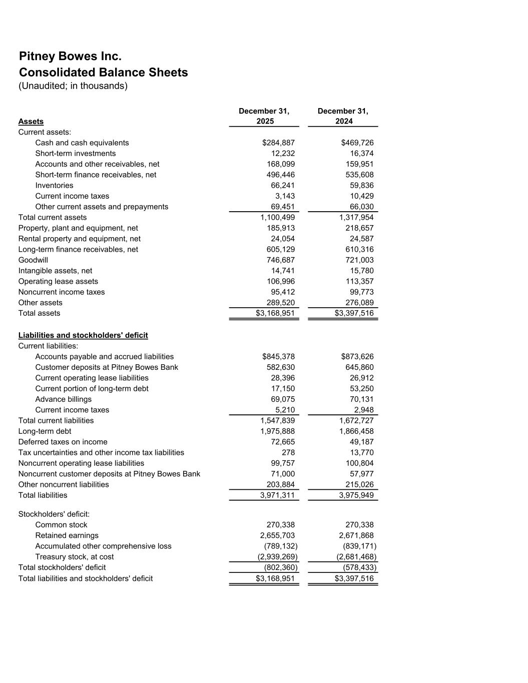 Pitney Bowes Inc. Consolidated Balance Sheets (Unaudited; in thousands) Assets December 31, 2025 December 31, 2024 Current assets: Cash and cash equivalents $284,887 $469,726 Short-term investments 12,232 16,374 Accounts and other receivables, net 168,099 159,951 Short-term finance receivables, net 496,446 535,608 Inventories 66,241 59,836 Current income taxes 3,143 10,429 Other current assets and prepayments 69,451 66,030 Total current assets 1,100,499 1,317,954 Property, plant and equipment, net 185,913 218,657 Rental property and equipment, net 24,054 24,587 Long-term finance receivables, net 605,129 610,316 Goodwill 746,687 721,003 Intangible assets, net 14,741 15,780 Operating lease assets 106,996 113,357 Noncurrent income taxes 95,412 99,773 Other assets 289,520 276,089 Total assets $3,168,951 $3,397,516 Liabilities and stockholders' deficit Current liabilities: Accounts payable and accrued liabilities $845,378 $873,626 Customer deposits at Pitney Bowes Bank 582,630 645,860 Current operating lease liabilities 28,396 26,912 Current portion of long-term debt 17,150 53,250 Advance billings 69,075 70,131 Current income taxes 5,210 2,948 Total current liabilities 1,547,839 1,672,727 Long-term debt 1,975,888 1,866,458 Deferred taxes on income 72,665 49,187 Tax uncertainties and other income tax liabilities 278 13,770 Noncurrent operating lease liabilities 99,757 100,804 Noncurrent customer deposits at Pitney Bowes Bank 71,000 57,977 Other noncurrent liabilities 203,884 215,026 Total liabilities 3,971,311 3,975,949 Stockholders' deficit: Common stock 270,338 270,338 Retained earnings 2,655,703 2,671,868 Accumulated other comprehensive loss (789,132) (839,171) Treasury stock, at cost (2,939,269) (2,681,468) Total stockholders' deficit (802,360) (578,433) Total liabilities and stockholders' deficit $3,168,951 $3,397,516