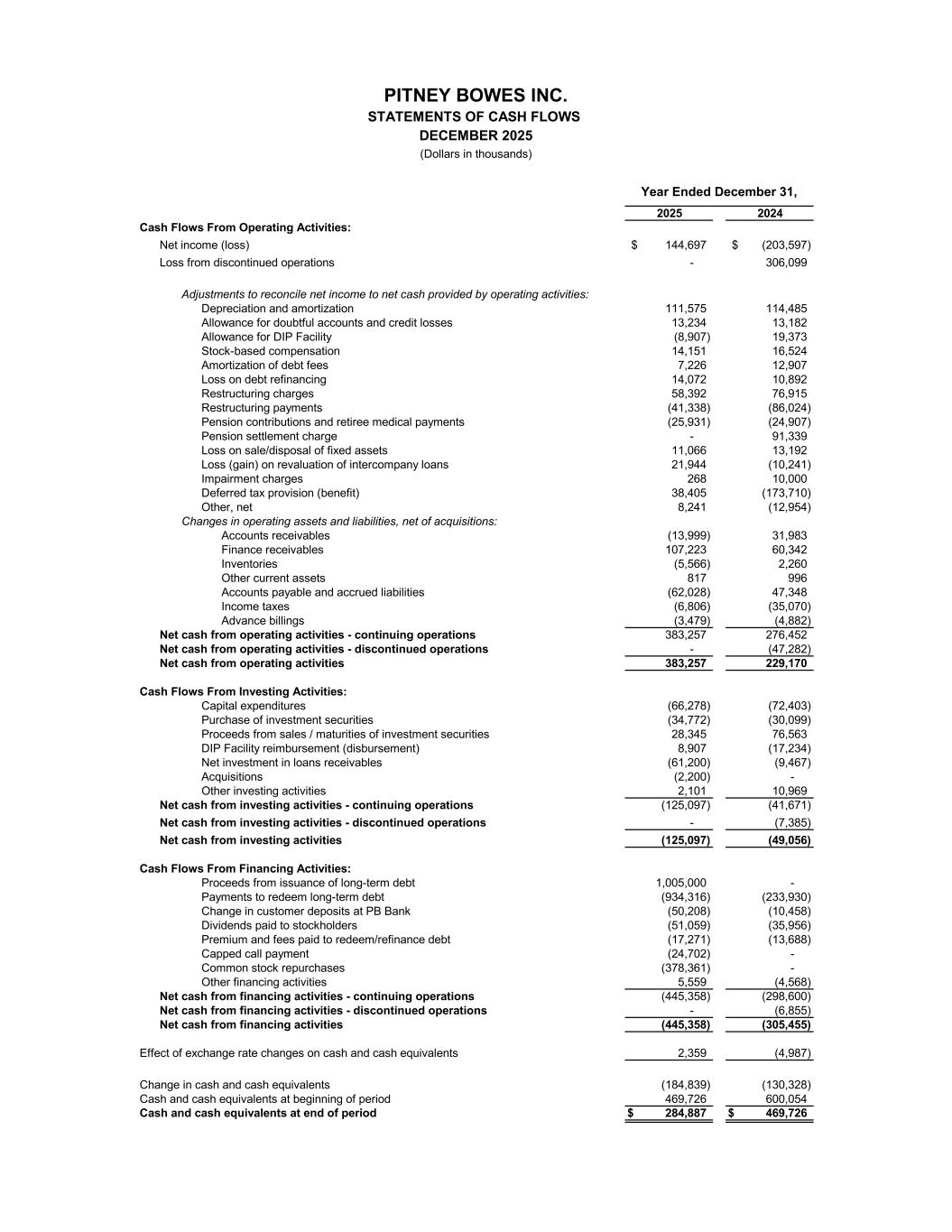 2025 2024 Cash Flows From Operating Activities: Net income (loss) 144,697$ (203,597)$ Loss from discontinued operations - 306,099 Adjustments to reconcile net income to net cash provided by operating activities: Depreciation and amortization 111,575 114,485 Allowance for doubtful accounts and credit losses 13,234 13,182 Allowance for DIP Facility (8,907) 19,373 Stock-based compensation 14,151 16,524 Amortization of debt fees 7,226 12,907 Loss on debt refinancing 14,072 10,892 Restructuring charges 58,392 76,915 Restructuring payments (41,338) (86,024) Pension contributions and retiree medical payments (25,931) (24,907) Pension settlement charge - 91,339 Loss on sale/disposal of fixed assets 11,066 13,192 Loss (gain) on revaluation of intercompany loans 21,944 (10,241) Impairment charges 268 10,000 Deferred tax provision (benefit) 38,405 (173,710) Other, net 8,241 (12,954) Changes in operating assets and liabilities, net of acquisitions: Accounts receivables (13,999) 31,983 Finance receivables 107,223 60,342 Inventories (5,566) 2,260 Other current assets 817 996 Accounts payable and accrued liabilities (62,028) 47,348 Income taxes (6,806) (35,070) Advance billings (3,479) (4,882) Net cash from operating activities - continuing operations 383,257 276,452 Net cash from operating activities - discontinued operations - (47,282) Net cash from operating activities 383,257 229,170 Cash Flows From Investing Activities: Capital expenditures (66,278) (72,403) Purchase of investment securities (34,772) (30,099) Proceeds from sales / maturities of investment securities 28,345 76,563 DIP Facility reimbursement (disbursement) 8,907 (17,234) Net investment in loans receivables (61,200) (9,467) Acquisitions (2,200) - Other investing activities 2,101 10,969 Net cash from investing activities - continuing operations (125,097) (41,671) Net cash from investing activities - discontinued operations - (7,385) Net cash from investing activities (125,097) (49,056) Cash Flows From Financing Activities: Proceeds from issuance of long-term debt 1,005,000 - Payments to redeem long-term debt (934,316) (233,930) Change in customer deposits at PB Bank (50,208) (10,458) Dividends paid to stockholders (51,059) (35,956) Premium and fees paid to redeem/refinance debt (17,271) (13,688) Capped call payment (24,702) - Common stock repurchases (378,361) - Other financing activities 5,559 (4,568) Net cash from financing activities - continuing operations (445,358) (298,600) Net cash from financing activities - discontinued operations - (6,855) Net cash from financing activities (445,358) (305,455) Effect of exchange rate changes on cash and cash equivalents 2,359 (4,987) Change in cash and cash equivalents (184,839) (130,328) Cash and cash equivalents at beginning of period 469,726 600,054 Cash and cash equivalents at end of period 284,887$ 469,726$ Year Ended December 31, DECEMBER 2025 (Dollars in thousands) PITNEY BOWES INC. STATEMENTS OF CASH FLOWS