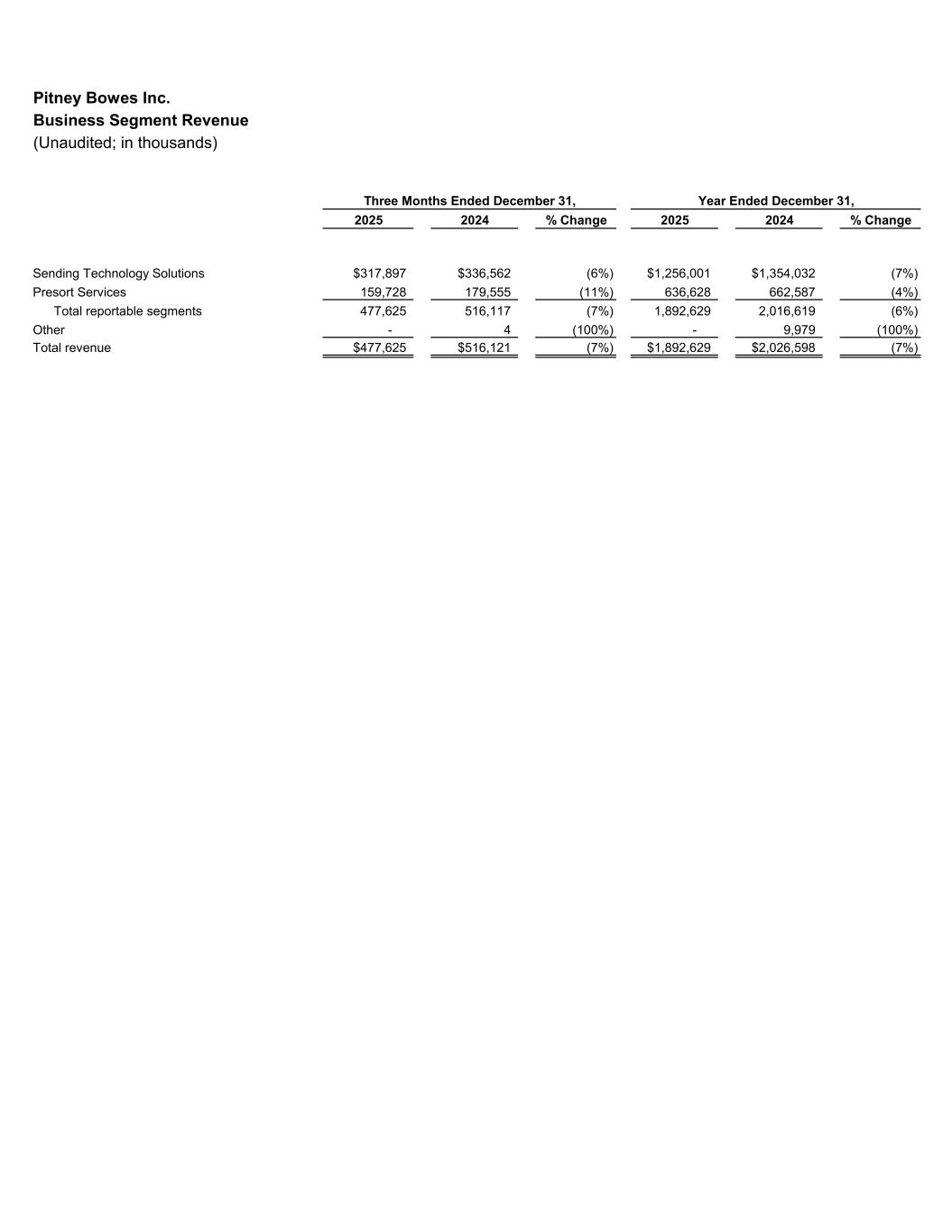Pitney Bowes Inc. Business Segment Revenue (Unaudited; in thousands) 2025 2024 % Change 2025 2024 % Change Sending Technology Solutions $317,897 $336,562 (6%) $1,256,001 $1,354,032 (7%) Presort Services 159,728 179,555 (11%) 636,628 662,587 (4%) Total reportable segments 477,625 516,117 (7%) 1,892,629 2,016,619 (6%) Other - 4 (100%) - 9,979 (100%) Total revenue $477,625 $516,121 (7%) $1,892,629 $2,026,598 (7%) Three Months Ended December 31, Year Ended December 31,