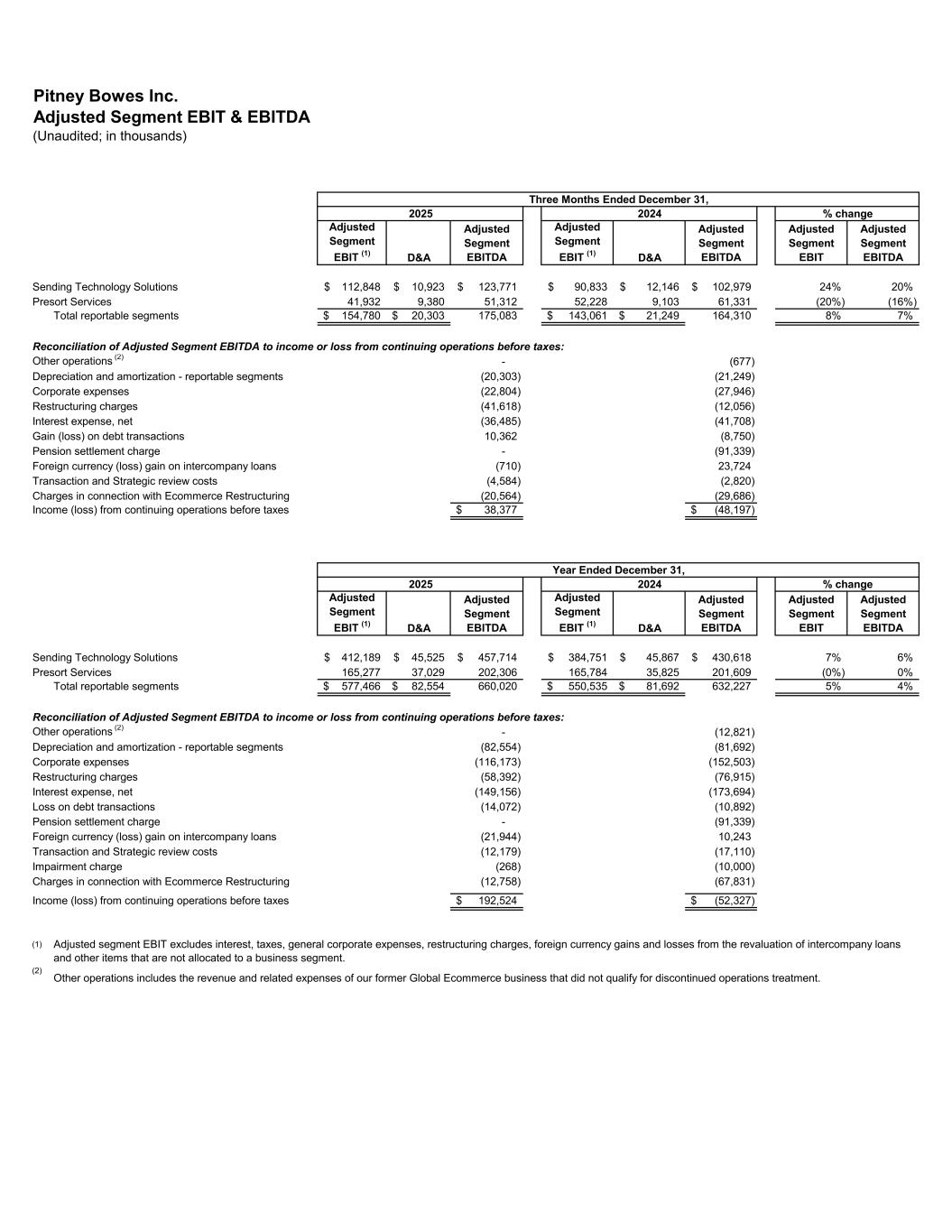 Pitney Bowes Inc. Adjusted Segment EBIT & EBITDA (Unaudited; in thousands) Adjusted Segment EBIT (1) D&A Adjusted Segment EBITDA Adjusted Segment EBIT (1) D&A Adjusted Segment EBITDA Adjusted Segment EBIT Adjusted Segment EBITDA Sending Technology Solutions 112,848$ 10,923$ 123,771$ 90,833$ 12,146$ 102,979$ 24% 20% Presort Services 41,932 9,380 51,312 52,228 9,103 61,331 (20%) (16%) Total reportable segments 154,780$ 20,303$ 175,083 143,061$ 21,249$ 164,310 8% 7% Reconciliation of Adjusted Segment EBITDA to income or loss from continuing operations before taxes: Other operations (2) - (677) Depreciation and amortization - reportable segments (20,303) (21,249) Corporate expenses (22,804) (27,946) Restructuring charges (41,618) (12,056) Interest expense, net (36,485) (41,708) Gain (loss) on debt transactions 10,362 (8,750) Pension settlement charge - (91,339) Foreign currency (loss) gain on intercompany loans (710) 23,724 Transaction and Strategic review costs (4,584) (2,820) Charges in connection with Ecommerce Restructuring (20,564) (29,686) Income (loss) from continuing operations before taxes 38,377$ (48,197)$ Adjusted Segment EBIT (1) D&A Adjusted Segment EBITDA Adjusted Segment EBIT (1) D&A Adjusted Segment EBITDA Adjusted Segment EBIT Adjusted Segment EBITDA Sending Technology Solutions 412,189$ 45,525$ 457,714$ 384,751$ 45,867$ 430,618$ 7% 6% Presort Services 165,277 37,029 202,306 165,784 35,825 201,609 (0%) 0% Total reportable segments 577,466$ 82,554$ 660,020 550,535$ 81,692$ 632,227 5% 4% Reconciliation of Adjusted Segment EBITDA to income or loss from continuing operations before taxes: Other operations (2) - (12,821) Depreciation and amortization - reportable segments (82,554) (81,692) Corporate expenses (116,173) (152,503) Restructuring charges (58,392) (76,915) Interest expense, net (149,156) (173,694) Loss on debt transactions (14,072) (10,892) Pension settlement charge - (91,339) Foreign currency (loss) gain on intercompany loans (21,944) 10,243 Transaction and Strategic review costs (12,179) (17,110) Impairment charge (268) (10,000) Charges in connection with Ecommerce Restructuring (12,758) (67,831) Income (loss) from continuing operations before taxes 192,524$ (52,327)$ (1) (2) Adjusted segment EBIT excludes interest, taxes, general corporate expenses, restructuring charges, foreign currency gains and losses from the revaluation of intercompany loans and other items that are not allocated to a business segment. Other operations includes the revenue and related expenses of our former Global Ecommerce business that did not qualify for discontinued operations treatment. Three Months Ended December 31, 2025 2024 Year Ended December 31, 2025 2024 % change % change