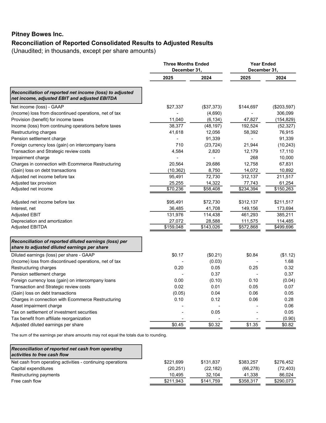 Pitney Bowes Inc. Reconciliation of Reported Consolidated Results to Adjusted Results (Unaudited; in thousands, except per share amounts) 2025 2024 2025 2024 Reconciliation of reported net income (loss) to adjusted net income, adjusted EBIT and adjusted EBITDA Net income (loss) - GAAP $27,337 ($37,373) $144,697 ($203,597) (Income) loss from discontinued operations, net of tax - (4,690) - 306,099 Provision (benefit) for income taxes 11,040 (6,134) 47,827 (154,829) Income (loss) from continuing operations before taxes 38,377 (48,197) 192,524 (52,327) Restructuring charges 41,618 12,056 58,392 76,915 Pension settlement charge - 91,339 - 91,339 Foreign currency loss (gain) on intercompany loans 710 (23,724) 21,944 (10,243) Transaction and Strategic review costs 4,584 2,820 12,179 17,110 Impairment charge - - 268 10,000 Charges in connection with Ecommerce Restructuring 20,564 29,686 12,758 67,831 (Gain) loss on debt transactions (10,362) 8,750 14,072 10,892 Adjusted net income before tax 95,491 72,730 312,137 211,517 Adjusted tax provision 25,255 14,322 77,743 61,254 Adjusted net income $70,236 $58,408 $234,394 $150,263 Adjusted net income before tax $95,491 $72,730 $312,137 $211,517 Interest, net 36,485 41,708 149,156 173,694 Adjusted EBIT 131,976 114,438 461,293 385,211 Depreciation and amortization 27,072 28,588 111,575 114,485 Adjusted EBITDA $159,048 $143,026 $572,868 $499,696 Reconciliation of reported diluted earnings (loss) per share to adjusted diluted earnings per share Diluted earnings (loss) per share - GAAP $0.17 ($0.21) $0.84 ($1.12) (Income) loss from discontinued operations, net of tax - (0.03) - 1.68 Restructuring charges 0.20 0.05 0.25 0.32 Pension settlement charge - 0.37 - 0.37 Foreign currency loss (gain) on intercompany loans 0.00 (0.10) 0.10 (0.04) Transaction and Strategic review costs 0.02 0.01 0.05 0.07 (Gain) loss on debt transactions (0.05) 0.04 0.06 0.05 Charges in connection with Ecommerce Restructuring 0.10 0.12 0.06 0.28 Asset impairment charge - - - 0.06 Tax on settlement of investment securities - 0.05 - 0.05 Tax benefit from affiliate reorganization - - - (0.90) Adjusted diluted earnings per share $0.45 $0.32 $1.35 $0.82 The sum of the earnings per share amounts may not equal the totals due to rounding. Reconciliation of reported net cash from operating activities to free cash flow Net cash from operating activities - continuing operations $221,699 $131,837 $383,257 $276,452 Capital expenditures (20,251) (22,182) (66,278) (72,403) Restructuring payments 10,495 32,104 41,338 86,024 Free cash flow $211,943 $141,759 $358,317 $290,073 Three Months Ended December 31, Year Ended December 31,