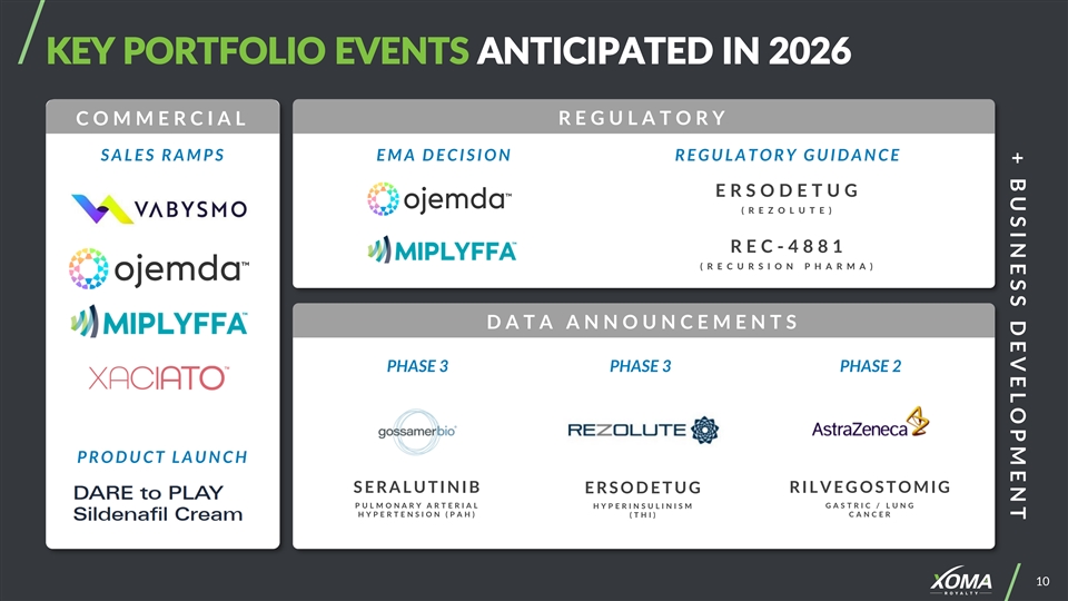 + B U S I N E S S D E V E L O P M E N T KEY PORTFOLIO EVENTS ANTICIPATED IN 2026 R E G U L A T O R Y C O M M E R C I A L S A L E S R A M P S E M A D E C I S I O N R E G U L A T O R Y G U I D A N C E E R S O D E T U G ( R E Z O L U T E ) R E C - 4881 ( R E C U R S I O N P H A R M A ) D A T A A N N O U N C E M E N T S PHASE 3 PHASE 3 PHASE 2 P R O D U C T L A U N C H S E R A L U T I N I B R I L V E G O S T O M I G E R S O D E T U G P U L M O N A R Y A R T E R I A L H Y P E R I N S U L I N I S M G A S T R I C / L U N G H Y P E R T E N S I O N ( P A H ) ( T H I ) C A N C E R 10