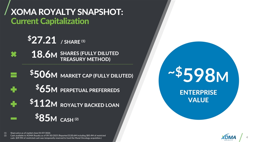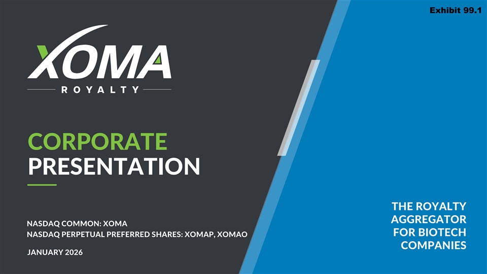 Exhibit 99.1 CORPORATE PRESENTATION THE ROYALTY AGGREGATOR NASDAQ COMMON: XOMA FOR BIOTECH NASDAQ PERPETUAL PREFERRED SHARES: XOMAP, XOMAO COMPANIES JANUARY 2026