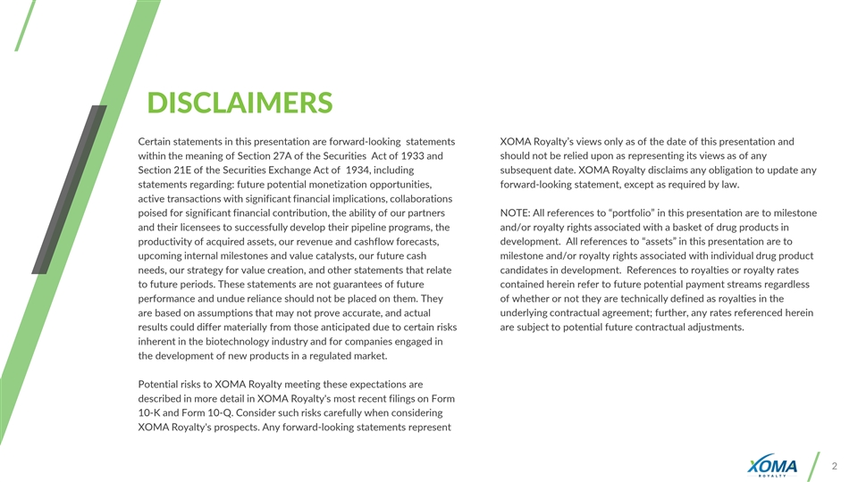 DISCLAIMERS Certain statements in this presentation are forward-looking statements XOMA Royalty’s views only as of the date of this presentation and within the meaning of Section 27A of the Securities Act of 1933 and should not be relied upon as representing its views as of any Section 21E of the Securities Exchange Act of 1934, including subsequent date. XOMA Royalty disclaims any obligation to update any statements regarding: future potential monetization opportunities, forward-looking statement, except as required by law. active transactions with significant financial implications, collaborations poised for significant financial contribution, the ability of our partners NOTE: All references to “portfolio” in this presentation are to milestone and their licensees to successfully develop their pipeline programs, the and/or royalty rights associated with a basket of drug products in productivity of acquired assets, our revenue and cashflow forecasts, development. All references to “assets” in this presentation are to upcoming internal milestones and value catalysts, our future cash milestone and/or royalty rights associated with individual drug product needs, our strategy for value creation, and other statements that relate candidates in development. References to royalties or royalty rates to future periods. These statements are not guarantees of future contained herein refer to future potential payment streams regardless performance and undue reliance should not be placed on them. They of whether or not they are technically defined as royalties in the are based on assumptions that may not prove accurate, and actual underlying contractual agreement; further, any rates referenced herein results could differ materially from those anticipated due to certain risks are subject to potential future contractual adjustments. inherent in the biotechnology industry and for companies engaged in the development of new products in a regulated market. Potential risks to XOMA Royalty meeting these expectations are described in more detail in XOMA Royalty's most recent filings on Form 10-K and Form 10-Q. Consider such risks carefully when considering XOMA Royalty's prospects. Any forward-looking statements represent 2
