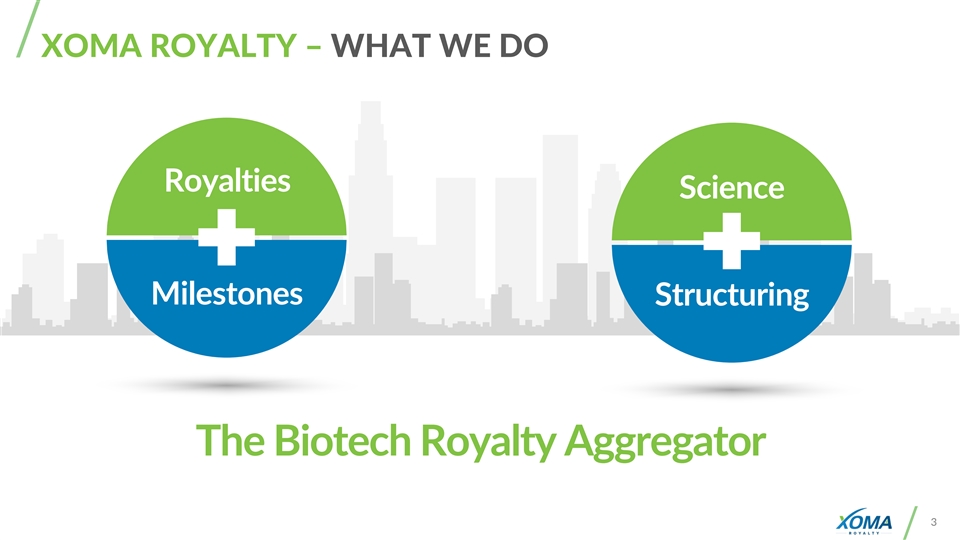 XOMA ROYALTY – WHAT WE DO Royalties Science Milestones Structuring The Biotech Royalty Aggregator 3