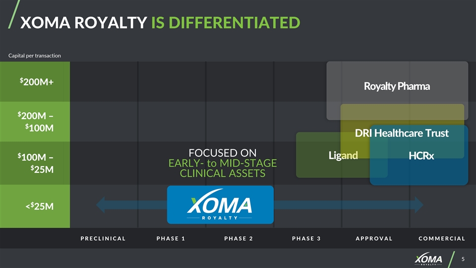 XOMA ROYALTY SNAPSHOT: Current Capitalization $ (1) 27.21 / SHARE SHARES (FULLY DILUTED 18.6M TREASURY METHOD) $ ~$ MARKET CAP (FULLY DILUTED) 506M 598M $ 65M PERPETUAL PREFERREDS ENTERPRISE VALUE $ 112M ROYALTY BACKED LOAN $ (2) 85M CASH (1) Share price as of market close 01/07/2026 (2) Cash available to XOMA Royalty as of 09/30/2025 (Reported $130.6M including $85.4M of restricted 4 4 cash. $39.9M of restricted cash was temporarily reserved to fund the Mural Oncology acquisition.)