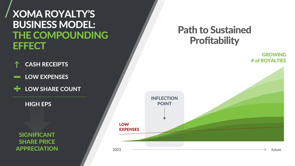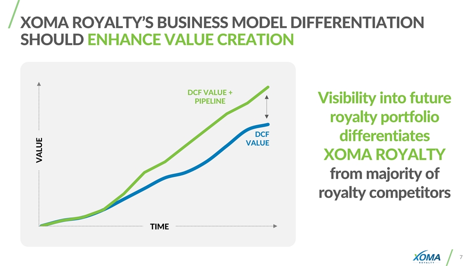 XOMA ROYALTY’S BUSINESS MODEL: Path to Sustained THE COMPOUNDING Profitability EFFECT GROWING # of ROYALTIES CASH RECEIPTS ↑ LOW EXPENSES LOW SHARE COUNT INFLECTION POINT HIGH EPS LOW EXPENSES SIGNIFICANT SHARE PRICE APPRECIATION 2023 future 6