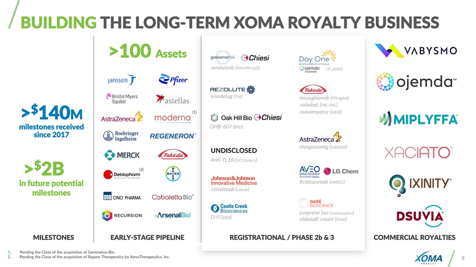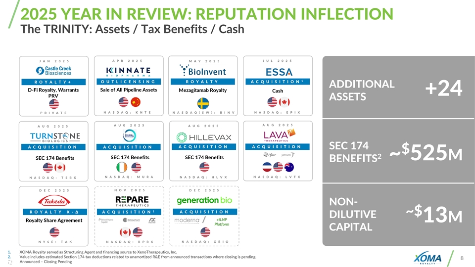 2025 YEAR IN REVIEW: REPUTATION INFLECTION The TRINITY: Assets / Tax Benefits / Cash A P R 2025 J U L 2025 J A N 2025 M A Y 2025 1 O U T L IC E N S IN G R O Y ALT Y A C Q U IS IT IO N R O Y ALT Y + ADDITIONAL D-Fi Royalty, Warrants Sale of All Pipeline Assets Mezagitamab Royalty Cash +24 PRV ASSETS N A S DA Q : K N T E N A S DA Q : E P I X P R I VAT E N A S DA Q ( S W ) : B I N V A U G 2025 A U G 2025 A U G 2025 A U G 2025 A C Q U IS IT IO N A C Q U IS IT IO N A C Q U IS IT IO N A C Q U IS IT IO N SEC 174 $ 2 SEC 174 Benefits SEC 174 Benefits SEC 174 Benefits ~ 525M BENEFITS N A S DA Q : M U R A N A S DA Q : L V T X N A S DA Q : T S B X N A S DA Q : H L V X N O V 2 025 D E C 2025 D E C 2025 NON- 1 R O Y ALT Y X -Δ A C Q U IS IT IO N A C Q U IS IT IO N ~$ DILUTIVE ctLNP Royalty Share Agreement 13M Platform CAPITAL N Y S E : T A K N A S DA Q : R P R X N A S DA Q : G B I O 1. XOMA Royalty served as Structuring Agent and financing source to XenoTherapeutics, Inc. 2. Value includes estimated Section 174 tax deductions related to unamortized R&E from announced transactions where closing is pending. 8 Announced – Closing Pending