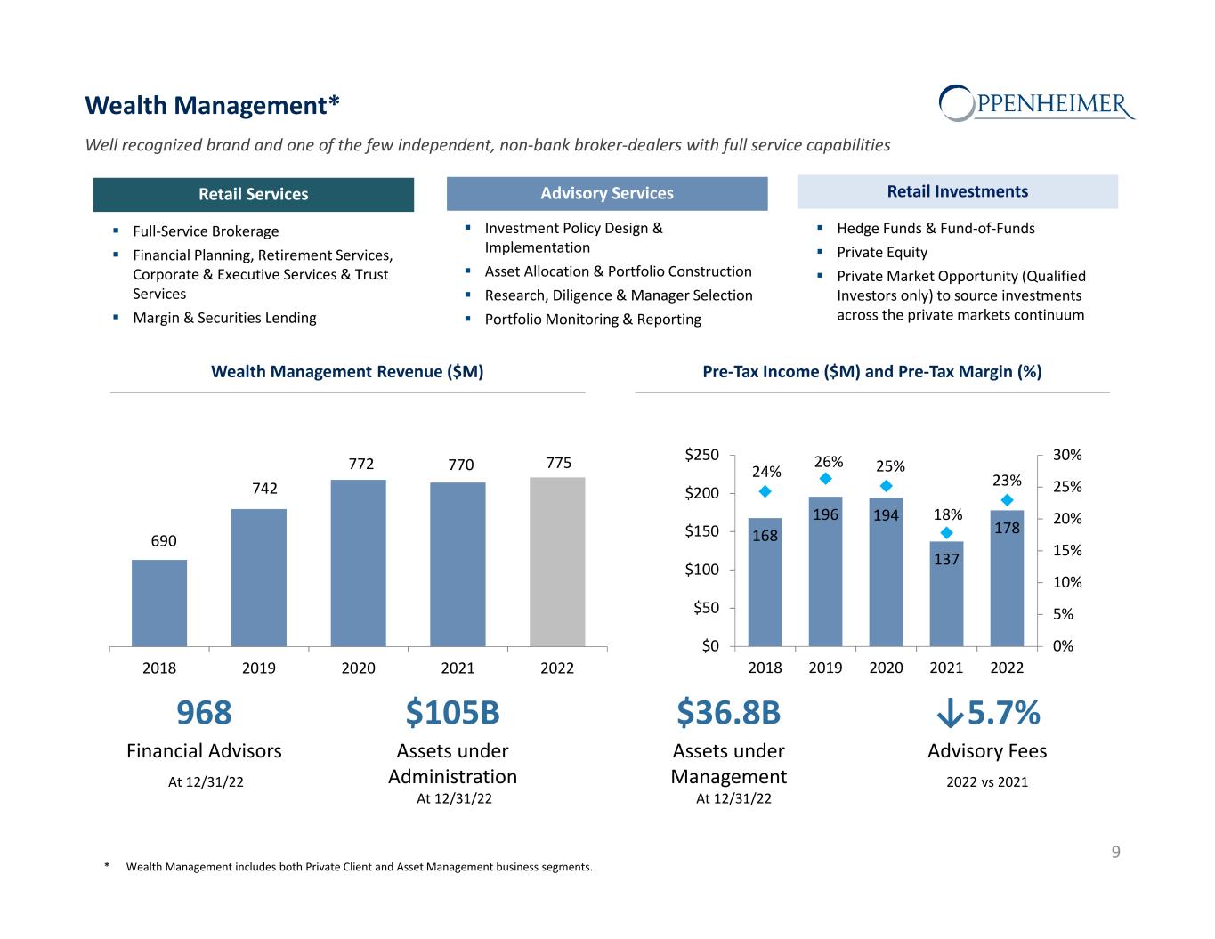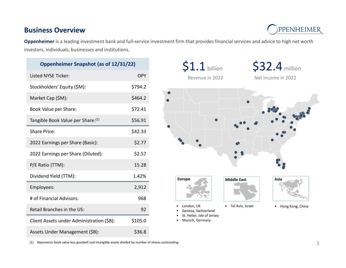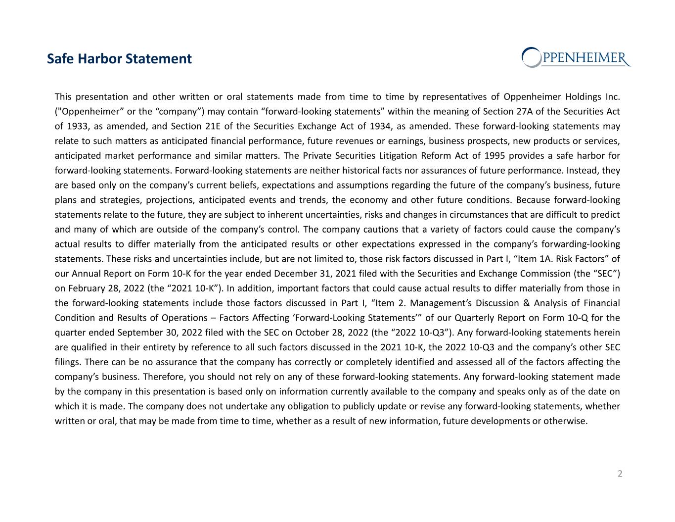 Safe Harbor Statement This presentation and other written or oral statements made from time to time by representatives of Oppenheimer Holdings Inc. ("Oppenheimer” or the “company”) may contain “forward-looking statements” within the meaning of Section 27A of the Securities Act of 1933, as amended, and Section 21E of the Securities Exchange Act of 1934, as amended. These forward-looking statements may relate to such matters as anticipated financial performance, future revenues or earnings, business prospects, new products or services, anticipated market performance and similar matters. The Private Securities Litigation Reform Act of 1995 provides a safe harbor for forward-looking statements. Forward-looking statements are neither historical facts nor assurances of future performance. Instead, they are based only on the company’s current beliefs, expectations and assumptions regarding the future of the company’s business, future plans and strategies, projections, anticipated events and trends, the economy and other future conditions. Because forward-looking statements relate to the future, they are subject to inherent uncertainties, risks and changes in circumstances that are difficult to predict and many of which are outside of the company’s control. The company cautions that a variety of factors could cause the company’s actual results to differ materially from the anticipated results or other expectations expressed in the company’s forwarding-looking statements. These risks and uncertainties include, but are not limited to, those risk factors discussed in Part I, “Item 1A. Risk Factors” of our Annual Report on Form 10-K for the year ended December 31, 2021 filed with the Securities and Exchange Commission (the “SEC”) on February 28, 2022 (the “2021 10-K”). In addition, important factors that could cause actual results to differ materially from those in the forward-looking statements include those factors discussed in Part I, “Item 2. Management’s Discussion & Analysis of Financial Condition and Results of Operations – Factors Affecting ‘Forward-Looking Statements’” of our Quarterly Report on Form 10-Q for the quarter ended September 30, 2022 filed with the SEC on October 28, 2022 (the “2022 10-Q3”). Any forward-looking statements herein are qualified in their entirety by reference to all such factors discussed in the 2021 10-K, the 2022 10-Q3 and the company’s other SEC filings. There can be no assurance that the company has correctly or completely identified and assessed all of the factors affecting the company’s business. Therefore, you should not rely on any of these forward-looking statements. Any forward-looking statement made by the company in this presentation is based only on information currently available to the company and speaks only as of the date on which it is made. The company does not undertake any obligation to publicly update or revise any forward-looking statements, whether written or oral, that may be made from time to time, whether as a result of new information, future developments or otherwise. 2
