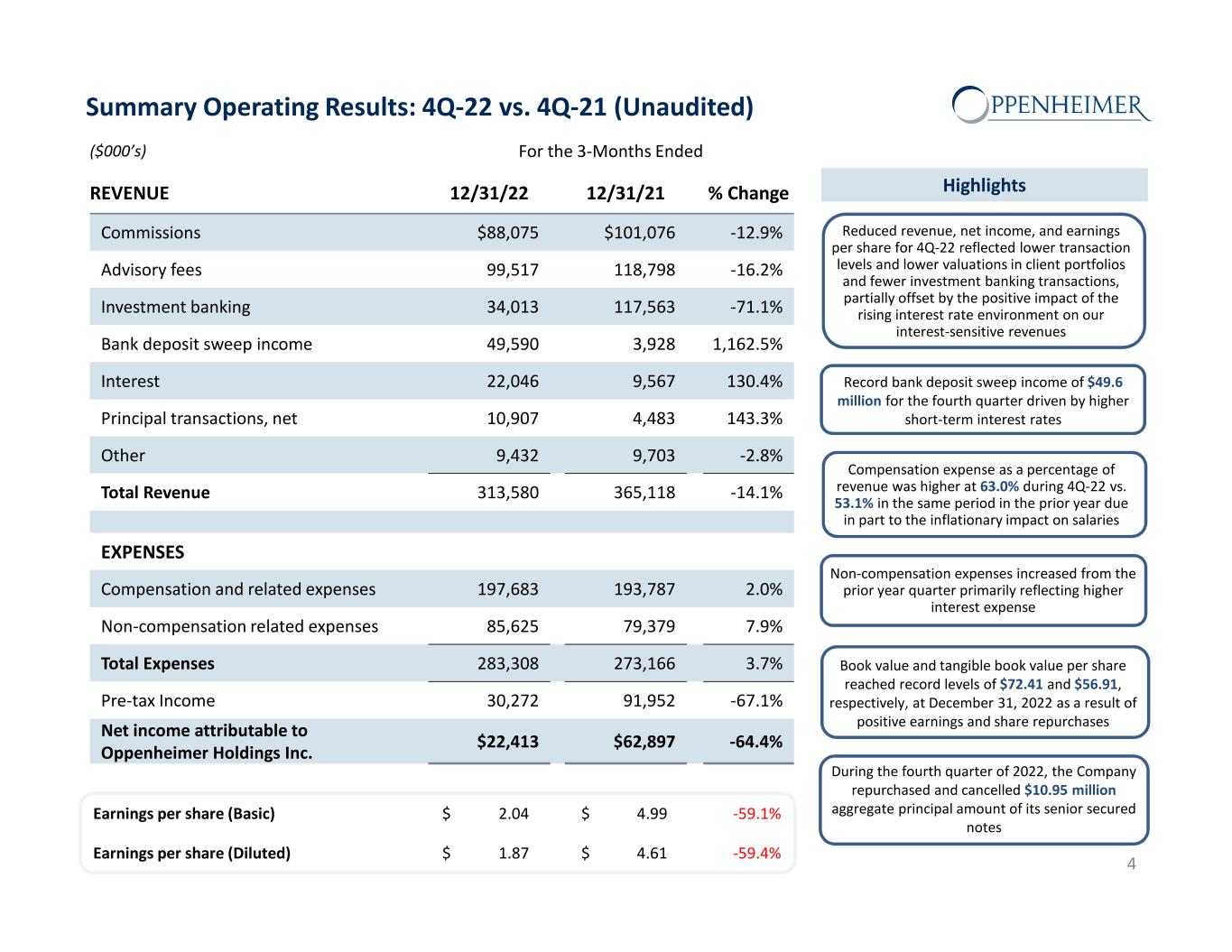 Oppenheimer is a leading investment bank and full-service investment firm that provides financial services and advice to high net worth investors, individuals, businesses and institutions. 3 • Hong Kong, China• London, UK • Geneva, Switzerland • St. Helier, Isle of Jersey • Munich, Germany • Tel Aviv, Israel (1) Represents book value less goodwill and intangible assets divided by number of shares outstanding. $32.4 million Net Income in 2022 $1.1 billion Revenue in 2022 Business Overview Oppenheimer Snapshot (as of 12/31/22) Listed NYSE Ticker: OPY Stockholders' Equity ($M): $794.2 Market Cap ($M): $464.2 Book Value per Share: $72.41 Tangible Book Value per Share:(1) $56.91 Share Price: $42.33 2022 Earnings per Share (Basic): $2.77 2022 Earnings per Share (Diluted): $2.57 P/E Ratio (TTM): 15.28 Dividend Yield (TTM): 1.42% Employees: 2,912 # of Financial Advisors: 968 Retail Branches in the US: 92 Client Assets under Administration ($B): $105.0 Assets Under Management ($B): $36.8