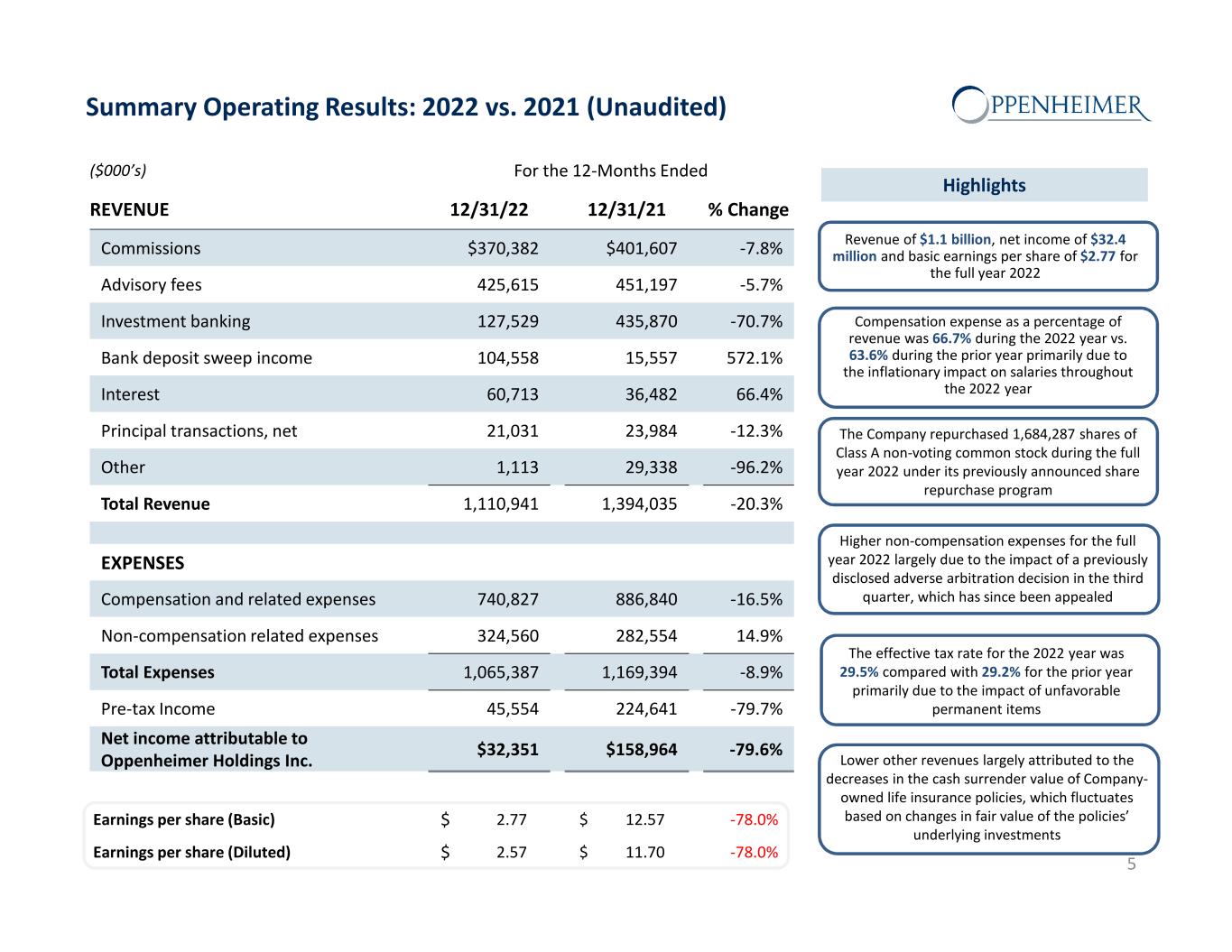 Earnings per share (Basic) $ 2.04 $ 4.99 -59.1% Earnings per share (Diluted) $ 1.87 $ 4.61 -59.4% Summary Operating Results: 4Q-22 vs. 4Q-21 (Unaudited) 4 Highlights ($000’s) For the 3-Months Ended REVENUE 12/31/22 12/31/21 % Change Commissions $88,075 $101,076 -12.9% Advisory fees 99,517 118,798 -16.2% Investment banking 34,013 117,563 -71.1% Bank deposit sweep income 49,590 3,928 1,162.5% Interest 22,046 9,567 130.4% Principal transactions, net 10,907 4,483 143.3% Other 9,432 9,703 -2.8% Total Revenue 313,580 365,118 -14.1% EXPENSES Compensation and related expenses 197,683 193,787 2.0% Non-compensation related expenses 85,625 79,379 7.9% Total Expenses 283,308 273,166 3.7% Pre-tax Income 30,272 91,952 -67.1% Net income attributable to Oppenheimer Holdings Inc. $22,413 $62,897 -64.4% Reduced revenue, net income, and earnings per share for 4Q-22 reflected lower transaction levels and lower valuations in client portfolios and fewer investment banking transactions, partially offset by the positive impact of the rising interest rate environment on our interest-sensitive revenues During the fourth quarter of 2022, the Company repurchased and cancelled $10.95 million aggregate principal amount of its senior secured notes Record bank deposit sweep income of $49.6 million for the fourth quarter driven by higher short-term interest rates Book value and tangible book value per share reached record levels of $72.41 and $56.91, respectively, at December 31, 2022 as a result of positive earnings and share repurchases Non-compensation expenses increased from the prior year quarter primarily reflecting higher interest expense Compensation expense as a percentage of revenue was higher at 63.0% during 4Q-22 vs. 53.1% in the same period in the prior year due in part to the inflationary impact on salaries