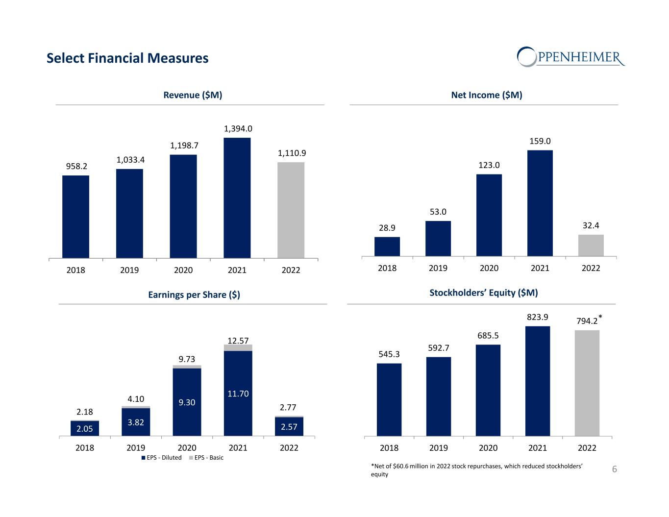 Earnings per share (Basic) $ 2.77 $ 12.57 -78.0% Earnings per share (Diluted) $ 2.57 $ 11.70 -78.0% Summary Operating Results: 2022 vs. 2021 (Unaudited) 5 Highlights ($000’s) For the 12-Months Ended REVENUE 12/31/22 12/31/21 % Change Commissions $370,382 $401,607 -7.8% Advisory fees 425,615 451,197 -5.7% Investment banking 127,529 435,870 -70.7% Bank deposit sweep income 104,558 15,557 572.1% Interest 60,713 36,482 66.4% Principal transactions, net 21,031 23,984 -12.3% Other 1,113 29,338 -96.2% Total Revenue 1,110,941 1,394,035 -20.3% EXPENSES Compensation and related expenses 740,827 886,840 -16.5% Non-compensation related expenses 324,560 282,554 14.9% Total Expenses 1,065,387 1,169,394 -8.9% Pre-tax Income 45,554 224,641 -79.7% Net income attributable to Oppenheimer Holdings Inc. $32,351 $158,964 -79.6% Higher non-compensation expenses for the full year 2022 largely due to the impact of a previously disclosed adverse arbitration decision in the third quarter, which has since been appealed The Company repurchased 1,684,287 shares of Class A non-voting common stock during the full year 2022 under its previously announced share repurchase program Lower other revenues largely attributed to the decreases in the cash surrender value of Company- owned life insurance policies, which fluctuates based on changes in fair value of the policies’ underlying investments Revenue of $1.1 billion, net income of $32.4 million and basic earnings per share of $2.77 for the full year 2022 Compensation expense as a percentage of revenue was 66.7% during the 2022 year vs. 63.6% during the prior year primarily due to the inflationary impact on salaries throughout the 2022 year The effective tax rate for the 2022 year was 29.5% compared with 29.2% for the prior year primarily due to the impact of unfavorable permanent items