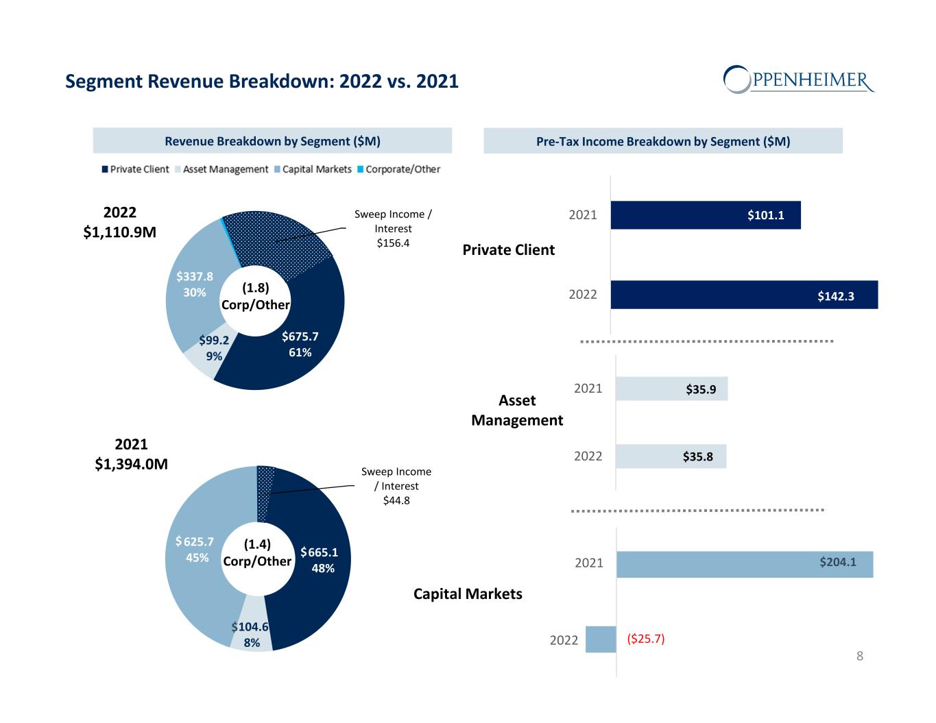 Segment Revenue Breakdown: 4Q-22 vs. 4Q-21 7 Pre-Tax Income Breakdown by Segment ($M)Revenue Breakdown by Segment ($M) $201.7 64% $22.9 7% $90.6 29% Sweep Income / Interest $68.5 (1.6) Corp/Other 4Q-22 Revenue $313.6M $173.3 47% 27.9 8% 165.6 45% Sweep Income / Interest $11.9 (1.7) Corp/Other 4Q-21 Revenue $365.1M $17.8 $(5.0) $5.0 $15.0 $25.0 $35.0 $45.0 4 Q -2 2 4 Q -2 1 $49.3 $9.8 $10.3 $(5.0) $5.0 $15.0 $25.0 $35.0 $45.0 4 Q -2 2 4 Q -2 1 Private Client Asset Management ($11.3) $(15.0) $(5.0) $5.0 $15.0 $25.0 $35.0 $45.0 4 Q -2 2 4 Q -2 1 $96.8 Capital Markets $ $