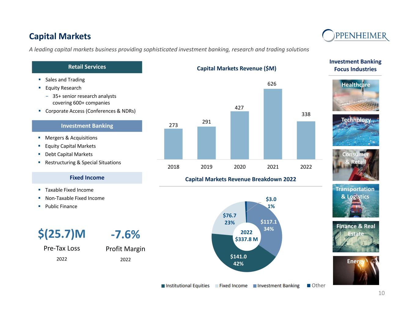 Wealth Management* Well recognized brand and one of the few independent, non-bank broker-dealers with full service capabilities Retail Services  Full-Service Brokerage  Financial Planning, Retirement Services, Corporate & Executive Services & Trust Services  Margin & Securities Lending Advisory Services  Investment Policy Design & Implementation  Asset Allocation & Portfolio Construction  Research, Diligence & Manager Selection  Portfolio Monitoring & Reporting Retail Investments  Hedge Funds & Fund-of-Funds  Private Equity  Private Market Opportunity (Qualified Investors only) to source investments across the private markets continuum Wealth Management Revenue ($M) Pre-Tax Income ($M) and Pre-Tax Margin (%) 968 Financial Advisors At 12/31/22 $105B Assets under Administration At 12/31/22 $36.8B Assets under Management At 12/31/22 ↓5.7% Advisory Fees 2022 vs 2021 * Wealth Management includes both Private Client and Asset Management business segments. 9 168 196 194 137 178 24% 26% 25% 18% 23% 0% 5% 10% 15% 20% 25% 30% $0 $50 $100 $150 $200 $250 2018 2019 2020 2021 2022 690 742 772 770 775 2018 2019 2020 2021 2022
