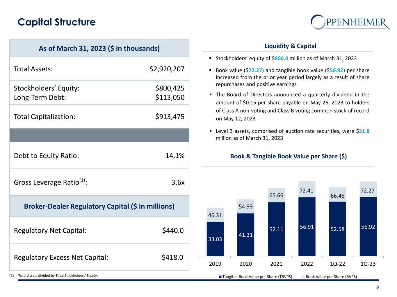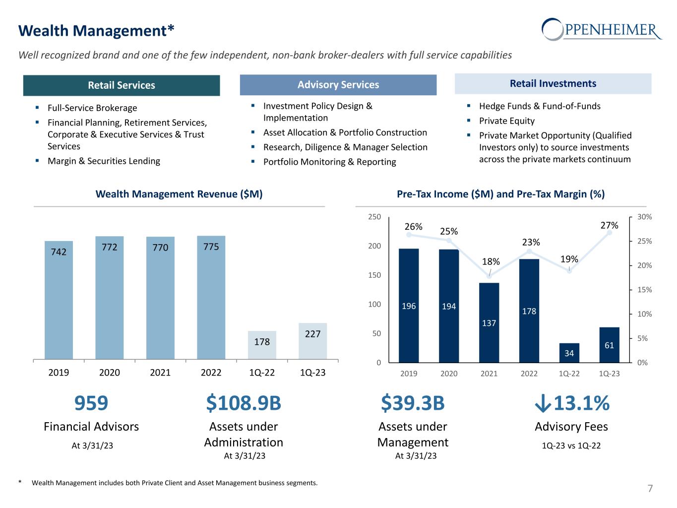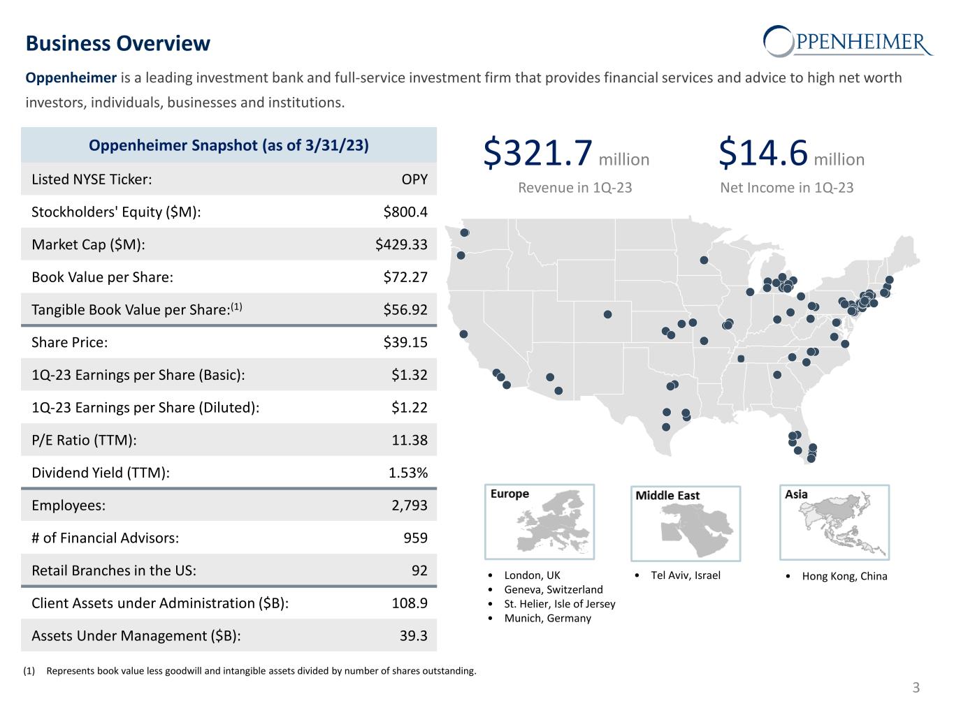 Safe Harbor Statement This presentation and other written or oral statements made from time to time by representatives of Oppenheimer Holdings Inc. ("Oppenheimer” or the “company”) may contain “forward-looking statements” within the meaning of Section 27A of the Securities Act of 1933, as amended, and Section 21E of the Securities Exchange Act of 1934, as amended. These forward-looking statements may relate to such matters as anticipated financial performance, future revenues or earnings, business prospects, new products or services, anticipated market performance and similar matters. The Private Securities Litigation Reform Act of 1995 provides a safe harbor for forward-looking statements. Forward-looking statements are neither historical facts nor assurances of future performance. Instead, they are based only on the company’s current beliefs, expectations and assumptions regarding the future of the company’s business, future plans and strategies, projections, anticipated events and trends, the economy and other future conditions. Because forward-looking statements relate to the future, they are subject to inherent uncertainties, risks and changes in circumstances that are difficult to predict and many of which are outside of the company’s control. The company cautions that a variety of factors could cause the company’s actual results to differ materially from the anticipated results or other expectations expressed in the company’s forwarding-looking statements. These risks and uncertainties include, but are not limited to, those risk factors discussed in Part I, “Item 1A. Risk Factors” of our Annual Report on Form 10-K for the year ended December 31, 2022 filed with the Securities and Exchange Commission (the “SEC”) on February 28, 2023 (the “2022 10-K”) and Quarterly Report on Form 10-Q for the quarter-ended March 31, 2023 filed with the SEC on April 28, 2023 (the “2023 10-Q1”). In addition, important factors that could cause actual results to differ materially from those in the forward-looking statements include those factors discussed in Part I, “Item 2. Management’s Discussion & Analysis of Financial Condition and Results of Operations – Factors Affecting ‘Forward-Looking Statements’” of the 2023 10-Q1. Any forward-looking statements herein are qualified in their entirety by reference to all such factors discussed in the 2022 10-K, the 2023 10-Q1 and the company’s other SEC filings. There can be no assurance that the company has correctly or completely identified and assessed all of the factors affecting the company’s business. Therefore, you should not rely on any of these forward-looking statements. Any forward- looking statement made by the company in this presentation is based only on information currently available to the company and speaks only as of the date on which it is made. The company does not undertake any obligation to publicly update or revise any forward- looking statements, whether written or oral, that may be made from time to time, whether as a result of new information, future developments or otherwise. 2