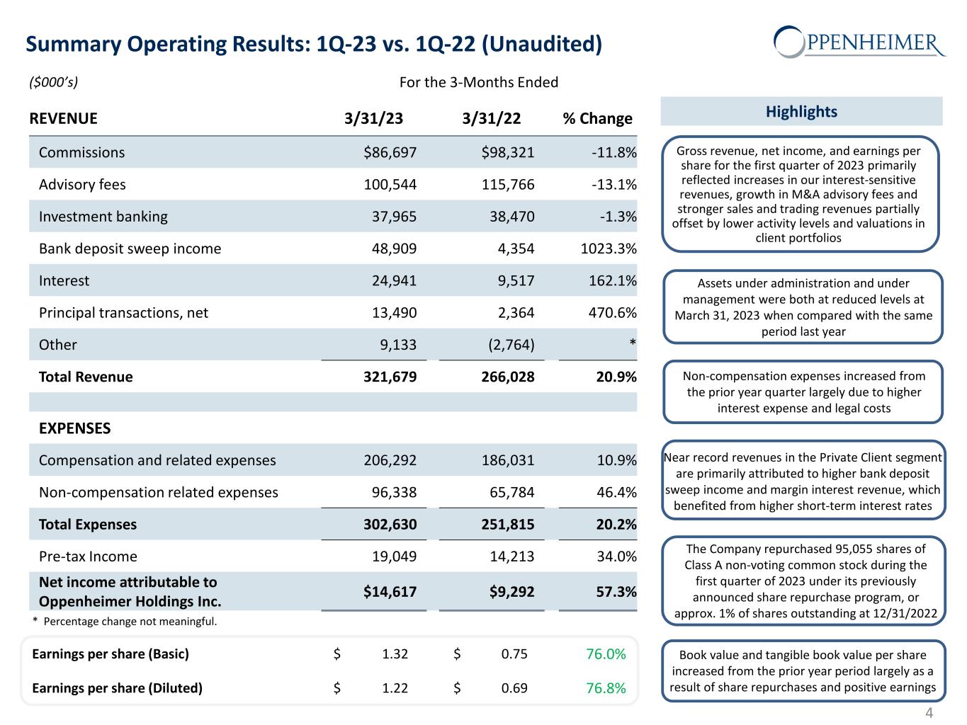 Oppenheimer is a leading investment bank and full-service investment firm that provides financial services and advice to high net worth investors, individuals, businesses and institutions. 3 • Hong Kong, China• London, UK • Geneva, Switzerland • St. Helier, Isle of Jersey • Munich, Germany • Tel Aviv, Israel (1) Represents book value less goodwill and intangible assets divided by number of shares outstanding. $14.6 million Net Income in 1Q-23 $321.7 million Revenue in 1Q-23 Business Overview Oppenheimer Snapshot (as of 3/31/23) Listed NYSE Ticker: OPY Stockholders' Equity ($M): $800.4 Market Cap ($M): $429.33 Book Value per Share: $72.27 Tangible Book Value per Share:(1) $56.92 Share Price: $39.15 1Q-23 Earnings per Share (Basic): $1.32 1Q-23 Earnings per Share (Diluted): $1.22 P/E Ratio (TTM): 11.38 Dividend Yield (TTM): 1.53% Employees: 2,793 # of Financial Advisors: 959 Retail Branches in the US: 92 Client Assets under Administration ($B): 108.9 Assets Under Management ($B): 39.3 .
