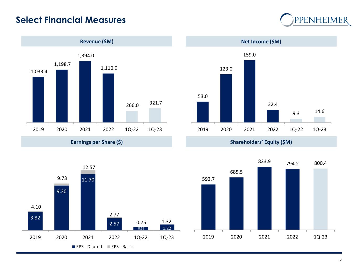 Earnings per share (Basic) $ 1.32 $ 0.75 76.0% Earnings per share (Diluted) $ 1.22 $ 0.69 76.8% Summary Operating Results: 1Q-23 vs. 1Q-22 (Unaudited) 4 Highlights ($000’s) For the 3-Months Ended REVENUE 3/31/23 3/31/22 % Change Commissions $86,697 $98,321 -11.8% Advisory fees 100,544 115,766 -13.1% Investment banking 37,965 38,470 -1.3% Bank deposit sweep income 48,909 4,354 1023.3% Interest 24,941 9,517 162.1% Principal transactions, net 13,490 2,364 470.6% Other 9,133 (2,764) * Total Revenue 321,679 266,028 20.9% EXPENSES Compensation and related expenses 206,292 186,031 10.9% Non-compensation related expenses 96,338 65,784 46.4% Total Expenses 302,630 251,815 20.2% Pre-tax Income 19,049 14,213 34.0% Net income attributable to Oppenheimer Holdings Inc. $14,617 $9,292 57.3% Gross revenue, net income, and earnings per share for the first quarter of 2023 primarily reflected increases in our interest-sensitive revenues, growth in M&A advisory fees and stronger sales and trading revenues partially offset by lower activity levels and valuations in client portfolios Assets under administration and under management were both at reduced levels at March 31, 2023 when compared with the same period last year Non-compensation expenses increased from the prior year quarter largely due to higher interest expense and legal costs Near record revenues in the Private Client segment are primarily attributed to higher bank deposit sweep income and margin interest revenue, which benefited from higher short-term interest rates The Company repurchased 95,055 shares of Class A non-voting common stock during the first quarter of 2023 under its previously announced share repurchase program, or approx. 1% of shares outstanding at 12/31/2022 Book value and tangible book value per share increased from the prior year period largely as a result of share repurchases and positive earnings * Percentage change not meaningful.