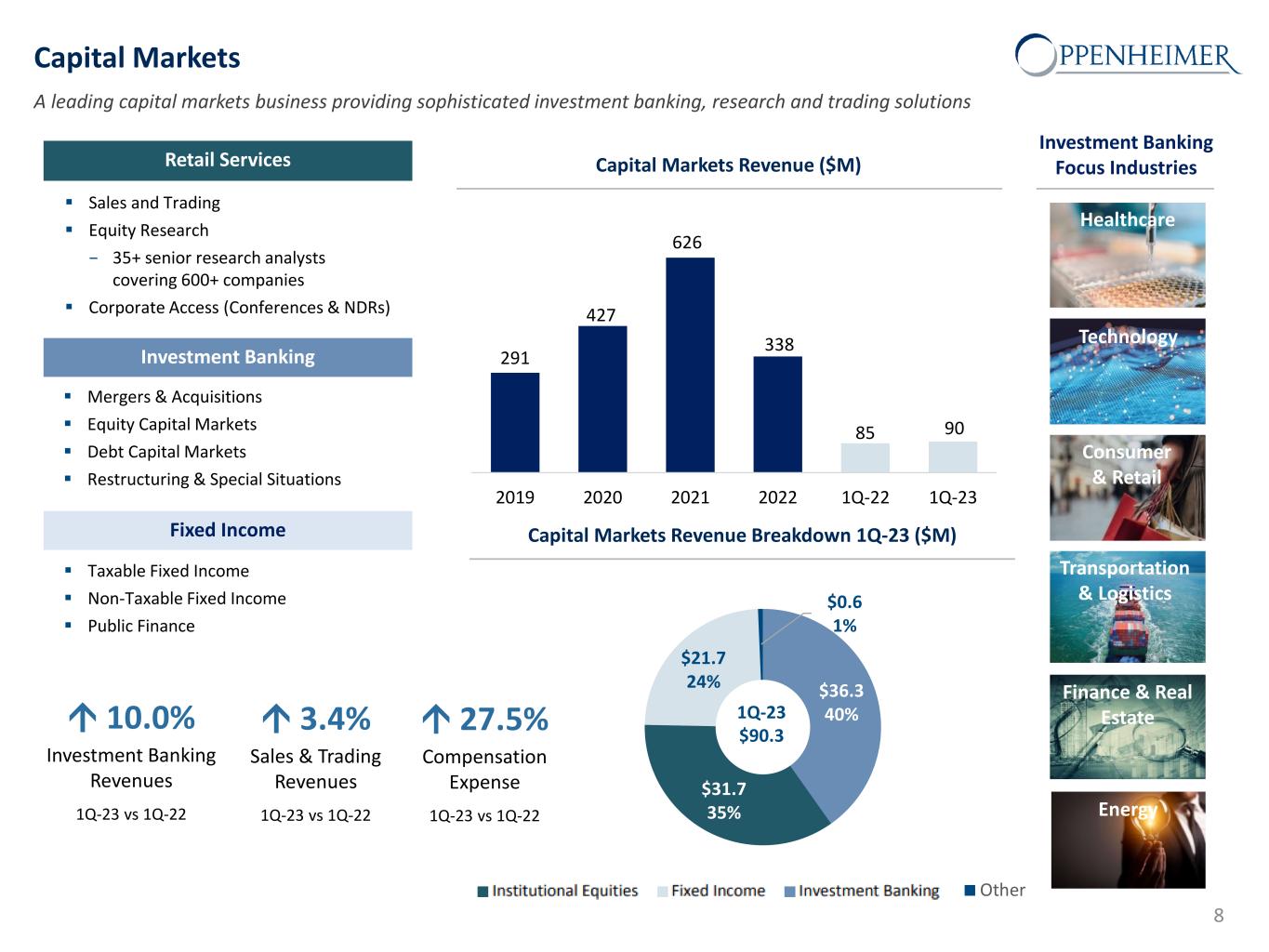 Wealth Management* Well recognized brand and one of the few independent, non-bank broker-dealers with full service capabilities Retail Services  Full-Service Brokerage  Financial Planning, Retirement Services, Corporate & Executive Services & Trust Services  Margin & Securities Lending Advisory Services  Investment Policy Design & Implementation  Asset Allocation & Portfolio Construction  Research, Diligence & Manager Selection  Portfolio Monitoring & Reporting Retail Investments  Hedge Funds & Fund-of-Funds  Private Equity  Private Market Opportunity (Qualified Investors only) to source investments across the private markets continuum Wealth Management Revenue ($M) Pre-Tax Income ($M) and Pre-Tax Margin (%) 959 Financial Advisors At 3/31/23 $108.9B Assets under Administration At 3/31/23 $39.3B Assets under Management At 3/31/23 ↓13.1% Advisory Fees 1Q-23 vs 1Q-22 * Wealth Management includes both Private Client and Asset Management business segments. 7 742 772 770 775 178 227 2019 2020 2021 2022 1Q-22 1Q-23 196 194 137 178 34 61 26% 25% 18% 23% 19% 27% 0% 5% 10% 15% 20% 25% 30% 0 50 100 150 200 250 2019 2020 2021 2022 1Q-22 1Q-23
